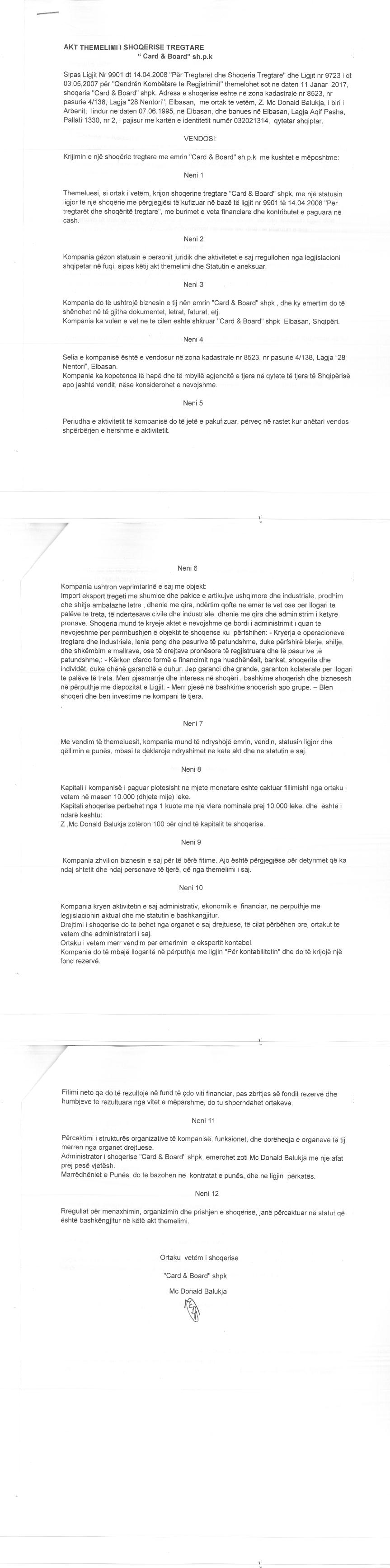 | Çështje Ligjore: | I. Me date 07/04/2017, me ane te Marreveshjes Siguruese mbi Kuotat e Pjesemarrjes ne Shoqeri date Nr. 289 Rep dhe 184 Kol date 06.04.2017 me barremarres / kredidhenes Raiffeisen Bank sh.a dhe barredhenes Mc Donald Balukja dhe Kredimarres shoqeria “Card& Board”shpk. II. Me date 17/11/2017, me ane te Marreveshje Siguruese mbi Kuotat e Pjesemarrjes ne Shoqeri Nr. 749 Rep., Nr. 346/4 kol., date 10.11.2017. III. Me date 20/02/2018, me ane te Marreveshjes Siguruese mbi Kuotat e Pjesemarrjes ne Shoqeri Nr. 112 Rep., Nr. 77 Kol., date 12.02.2018 e lidhur midis shoqërisë “Card & Board” sh.p.k., (kredimarrës), z. Mc Donald Balukja (barrëdhënës) dhe shoqerise “Raiffeisen Bank” sh.a, (barremarresi/kredidhënës). IV. Me date 14.11.2018, me vendim te ortakut te vetem, u vendos: Pezullim i Aktivitetit. Statusi i Shoqerise kalon nga "Aktiv" ne "Pezulluar" |