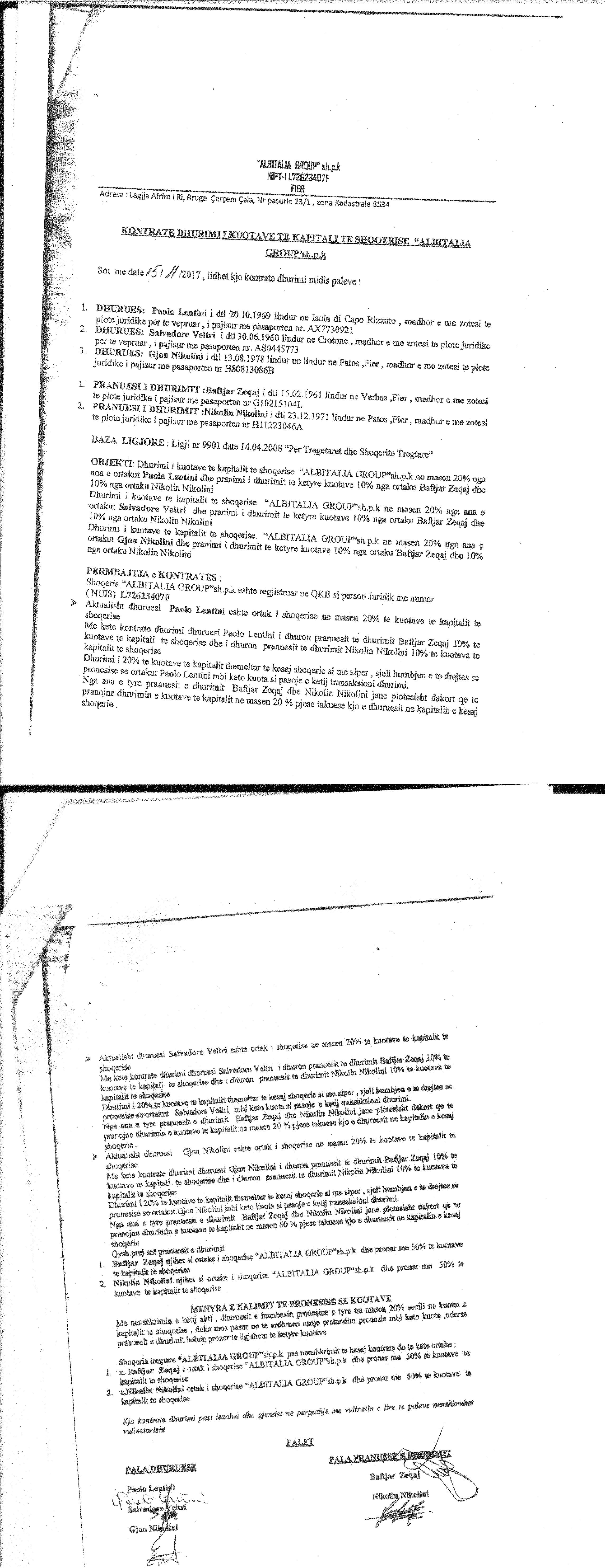 → Ekstrakt Historik i Regjistrit Tregtar date 14.02.2023 → Akt themelimi i Shoqerise → Kontrate Dhurimi i Kuotave date 15.11.2017 → Kontrate per Shitjen e Kuotave date 15.02.2021 |