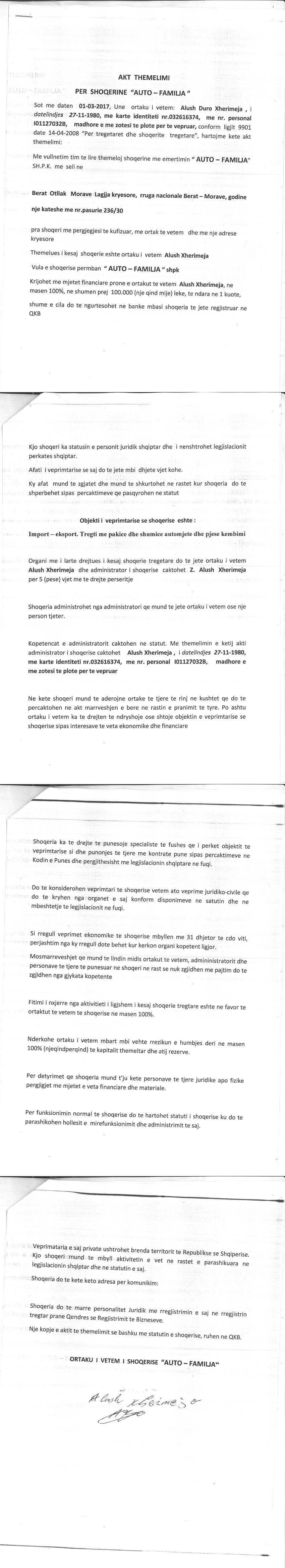 | Çështje Ligjore: | I. Me date 06.03.2017, me vendim te ortakut te vetem, u vendos: Pushim i Perkohshem i Aktivitetit. Statusi i Shoqerise kalon nga "Aktiv" ne "Pezulluar" II. Me date 21.09.2017, me kerkese te administratorit te shoqerise, u kerkua: Aktivizim i Aktivitetit. Statusi i Shoqerise kalon nga "Pezulluar" ne "Aktiv" |