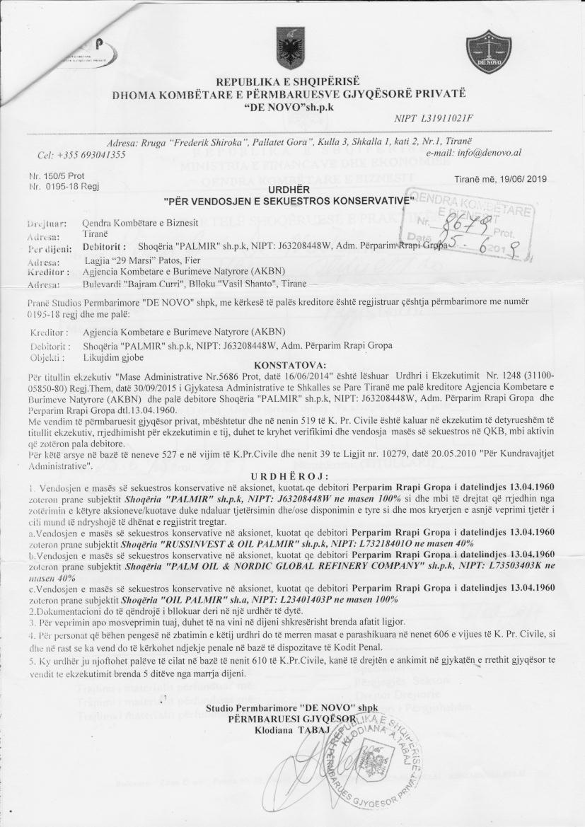 aktivitetit te shoqerise, nga data 23.10.2017 - pa afat. Statusi i shoqerise ishte "Aktiv" dhe u be "Pezulluar". II. Me date 19.06.2019 me ane te Urdhrit nr. 150/5Prot., nr.0195-18Regj., datë 19.06.2019, lëshuar nga Shoqëria Përmbarimore “DE NOVO” sh.p.k, me përmbarues gjyqësor Klodiana Tabaj protokolluar nga QKB me nr. 8679Prot., datë 25.06.2019, u urdhërua QKB për: “Vendosjen e masës së sekuestros konservative mbi kuotat/aksionet që debitorit Perparim Gropa zotëron pranë subjektit “RUSSINVEST & OIL PALMIR” SHPK me Nipt L73218401O, në masën 40% si dhe mbi të drejtat që rrjedhin nga zotërimi i këtyre kuotave/aksioneve duke ndaluar tjetërsimin dhe/ose disponimin e tyre si dhe mos kryerjen e asnje veprimi tjeter I cili mund të ndryshojë të dhënat e regjistrit tregtar”. III. Me date 31.05.2022 me ane te Urdhrit nr.194/7 Prot., nr.0195-18 Dosje, datë 31.05.2022, lëshuar nga Shoqëria Përmbarimore “BESA” sh.p.k, me përmbarues gjyqësor Klodiana Tabaj, u urdhërua QKB për: Heqjen e masës së sekuestros konservative mbi kuotat/aksionet që debitorit Perparim Gropa zotëron pranë subjektit “RUSSINVEST & OIL PALMIR” SHPK me Nipt L73218401O.Heqjen e masës së sekuestros konservative në të tjera kuota/aksione që pala debitore zotëron në shoqëri të tjera të regjistruara pranë regjistrit tregtar. |