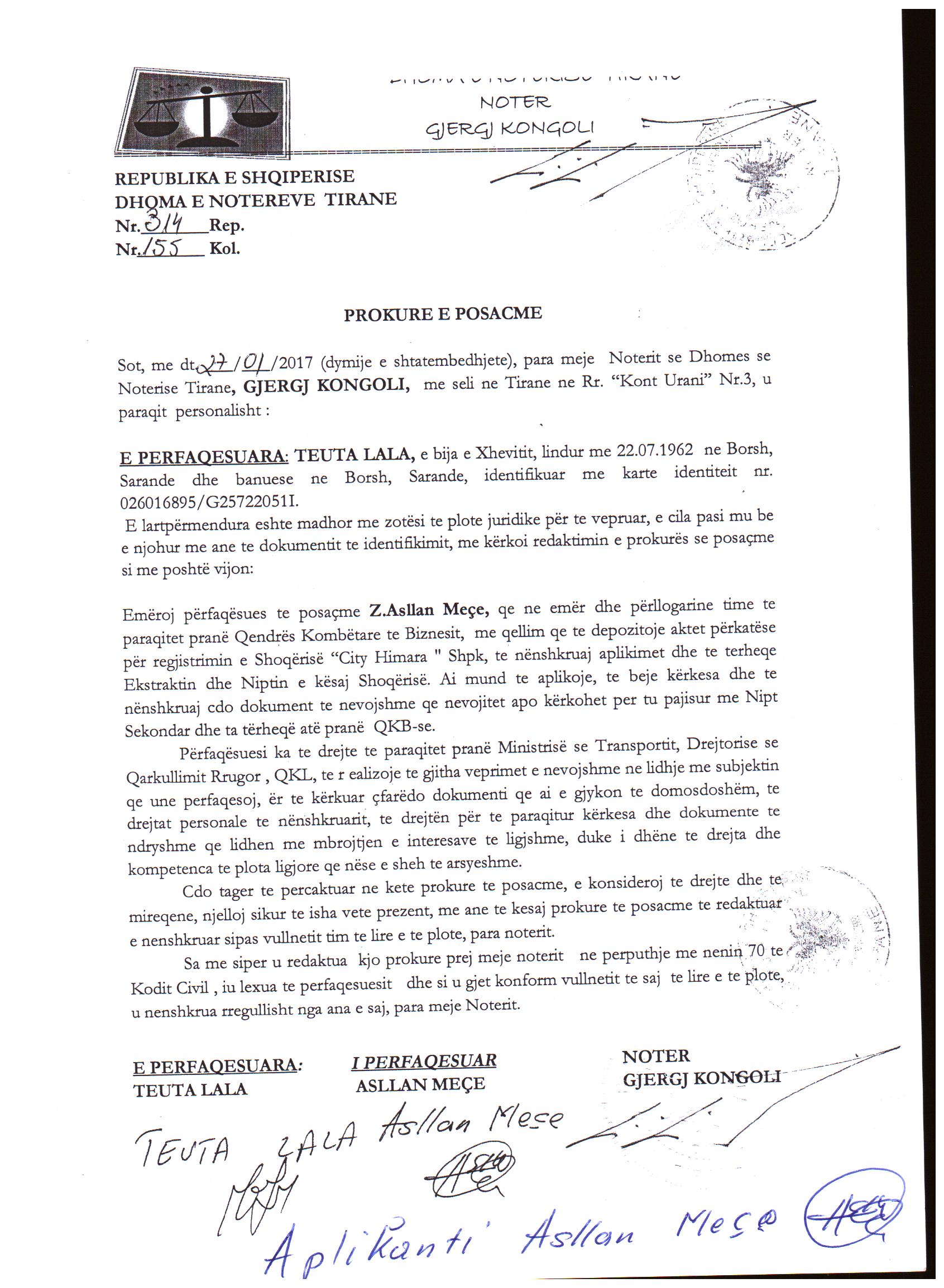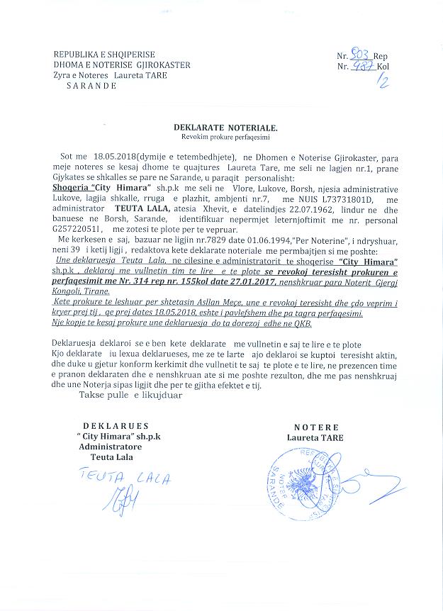 leshuar nga Teuta Lala, e cila emeron si perfaqesues te posacem Asllan Meçe me tagra perfaqesimi sipas kesaj procure. II. Me date 21/05/2018, me ane te Deklaratës Noteriale Nr.903Rep., Nr.487/2Kol., datë 18.05.2018 për revokimin e prokurës së posaçme Nr.314 Rep., Nr. 155Kol., datë 27.01.2017. |