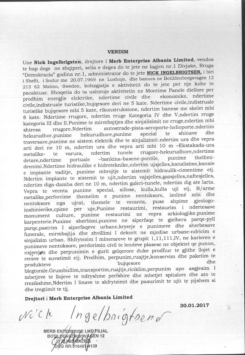 | Shoqëri e huaj për këtë subjekt: | Shoqeria “ MERB ENTREPRISE ALBANIA LIMITED “, eshte një shoqëri me pergjegjesi te kufizuar e themeluar më 15.12.2016 sipas Aktit te Kompanive 2006, ne Regjistrin e Kompanive per Angline dhe Uellsin, me numer kompanie 10527887, me drejtor Nick Ingelbrigtsen. (Sipas Certifikates se Inkorporimit te Shoqerise se Huaj) Subjekti Juridik nuk ka regjistruar të dhëna në regjistrin e pronarëve përfitues RPP deri me date 25.01.2023 |