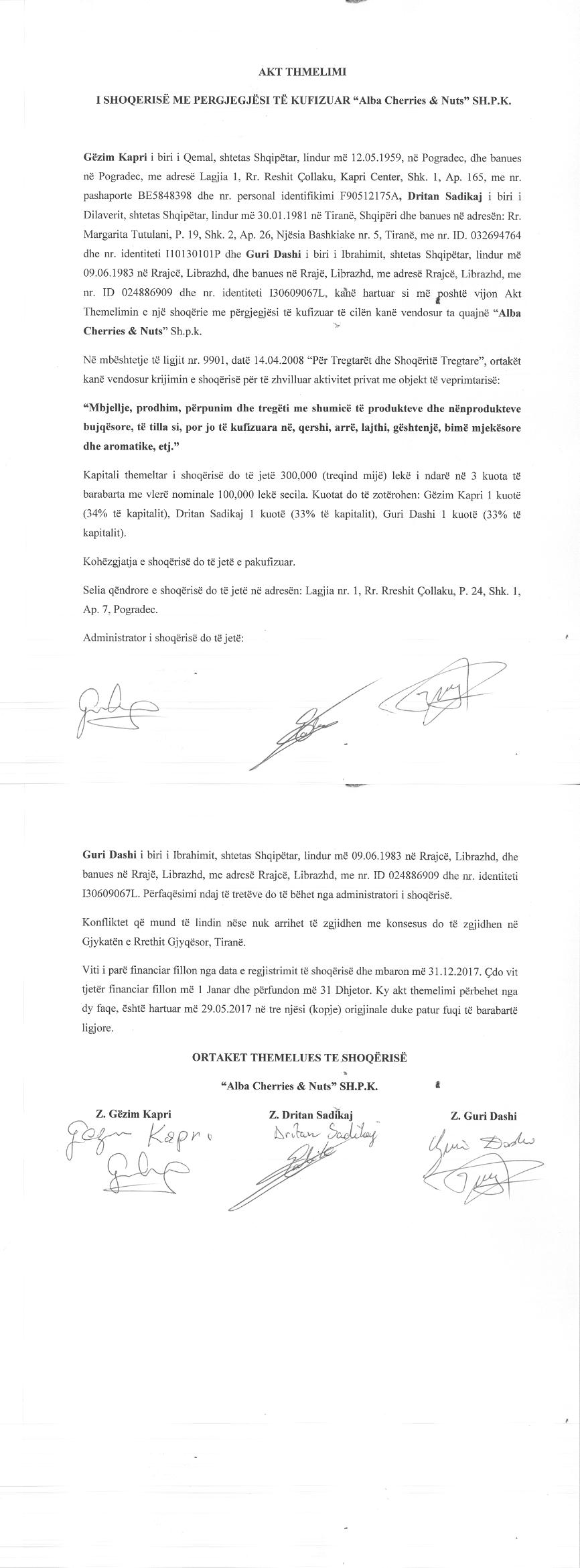 | Objekti i Veprimtarisë: | Mbjellje, prodhim, perpunim dhe tregeti me shumice te produkteve dhe nenprodukteve bujqesore, te tilla si, por jo te kufizuara ne, qershi, arre, lajthi, geshtenje, bime mjekesore dhe aromatike, etj. |