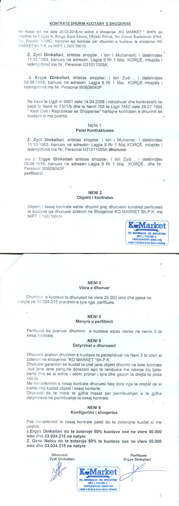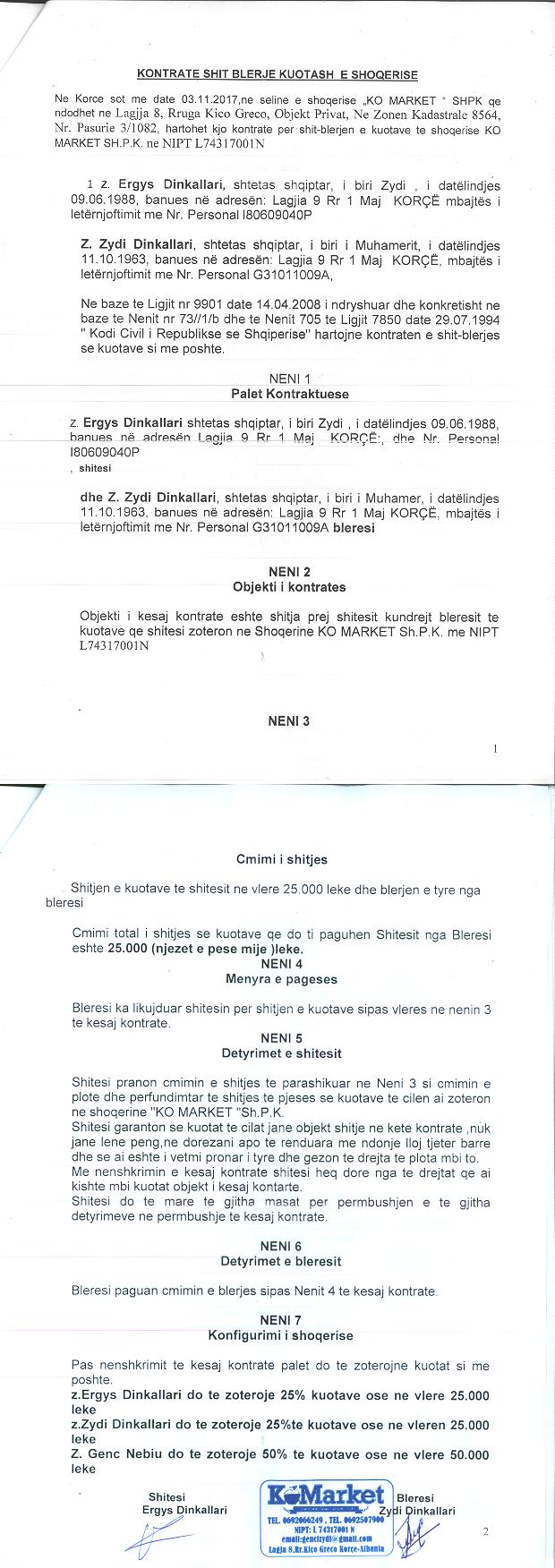 → Ekstrakt Historik i Regjistrit Tregtar, date 16.01.2023 → Statuti i Shoqerise → Kontrate Shitblerje Kuotash, date 03.11.2017 → Vendim i Asamblese së Ortakeve, Zmadhim Kapitali date 20.11.2017 → Kontrate Dhurimi Kuotash, date 30.03.2018 |