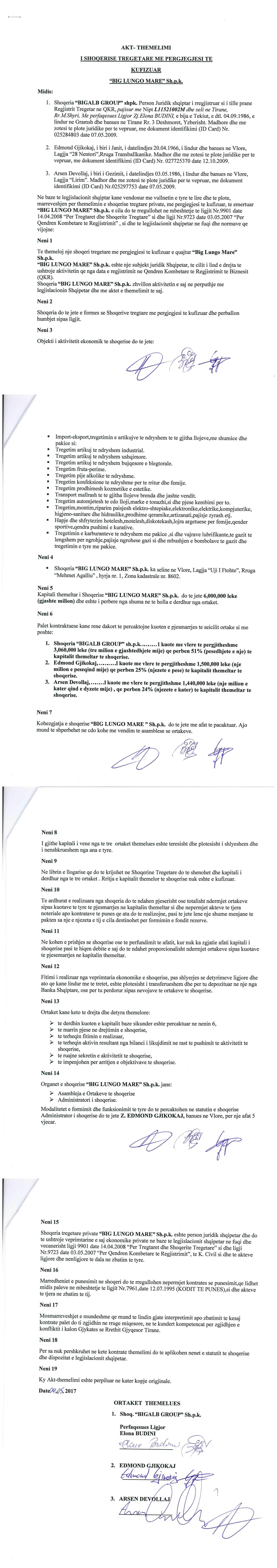 | Shoqëri Mëmë / Zotërues për këtë Subjekt: | “BIGALB GROUP”, shoqëri me përgjegjësi të kufizuar, e themeluar më datë 17/03/2011, sipas ligjeve të Republikës së Shqipërisë, me numër identifikimi në regjistrin tregtar NIPT L11521002M, me adresë në aktuale në Tirane Vaqarr GROPAJ Fshati Gropaj, Godina Tirana Cash & Carry, Kati 2, Vaqarr, dhe me administrator Elona Koshi. Ortak i vetëm i shoqërisë është Vullnet Sinaj (zoterues pasiv), zotërues për 100% të kapitalit. (Sipas të dhënave të QKB deri më datë 29.08.2024) Sipas Ekstraktit Historik te Regjistrit te Pronarit Perfitues, depozituar në QKB date 29.03.2021, terhequr datë 29.08.2024, Pronaret perfitues te subjektit “BIG LUNGO MARE”, zoterues te 25% te kapitalit e me teper, janë: Vullnet Sinaj, shtetas shqiptar, i datelindjes 1965, pronar perfitues per 51% te pronesise pasi zoteron 100% te kapitalit të “BIGALB GROUP” shpk – shoqëri mëmë për 51% te “BIG LUNGO MARE”. Data e percaktimit si pronar perfitues është 04.05.2017. Edmond Gjikokaj, shtetas shqiptar, i datelindjes 1966, pronar perfitues per 25% te pronesise në formë direkte. Data e percaktimit si pronar perfitues është 04.05.2017. |