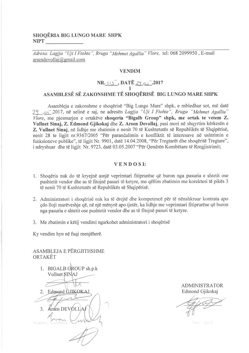 | Shënime: | Kompetencat e Administratorit: Administratori i shoqerise nuk ka te drejte dhe kompetence per te nenshkruar kontrata apo cdo lloj mareveshje qe ne nje menyre apo tjeter, ka lidhje me veprimtari fitimprurese qe buron nga pasuria e shtetit ose pushtetit vendor dhe as te fitojne pasuri te ketyre. |