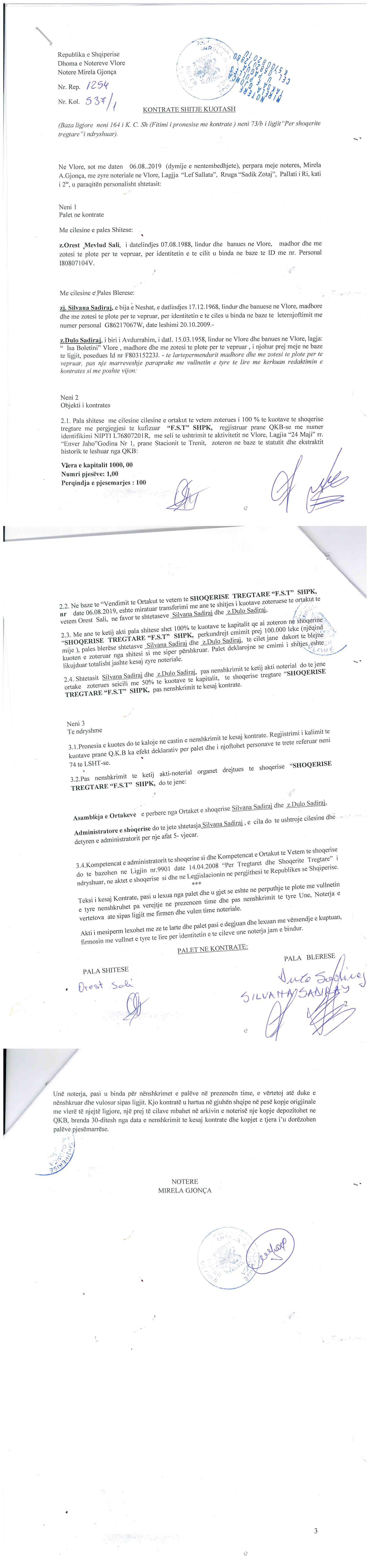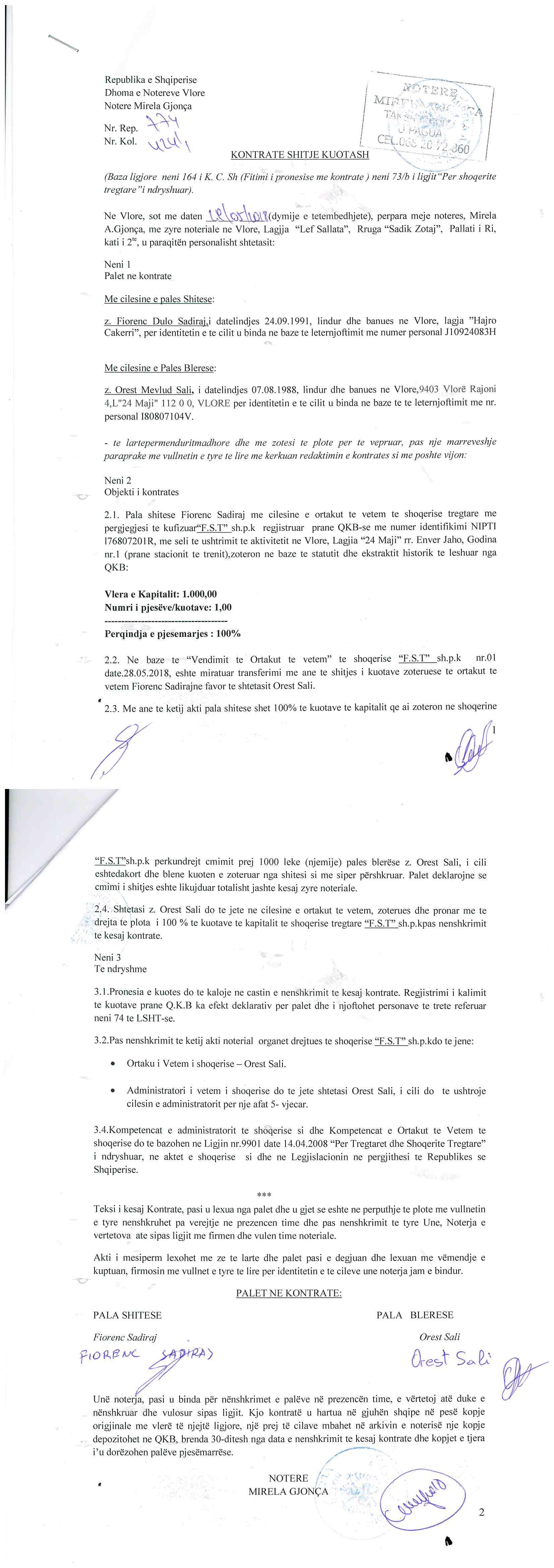 → Ekstrakti Historik i Regjistrit Tregtar date 16.02.2022 → Statuti i Shoqerise → Kontrate e Shitjes se Kuotave date 29.05.2018 → Kontrate e Shitjes se Kuotave date 06.08.2019 |
