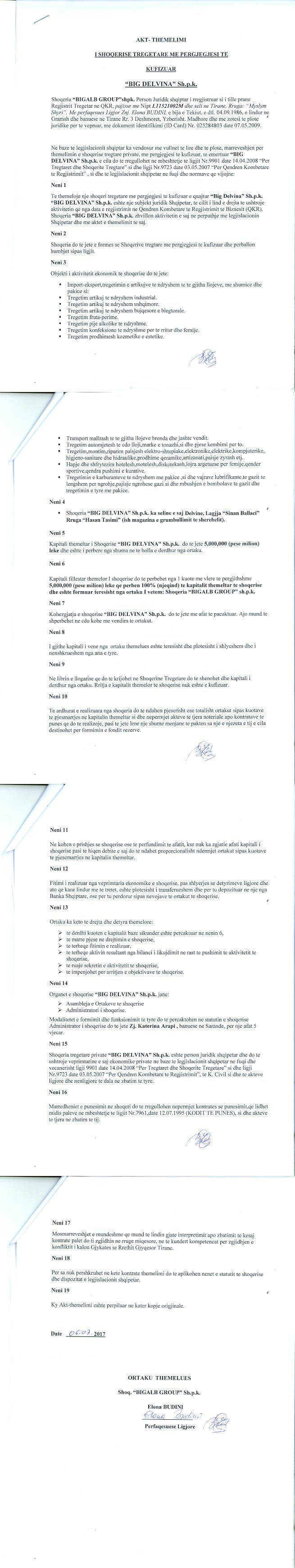 | Shoqëri Mëmë / Zotërues për këtë Subjekt: | “BIGALB GROUP”, shoqëri me përgjegjësi të kufizuar, e themeluar më datë 17/03/2011, sipas ligjeve të Republikës së Shqipërisë, me numër identifikimi në regjistrin tregtar NIPT L11521002M, me adresë në aktuale në Tirane Vaqarr GROPAJ Fshati Gropaj, Godina Tirana Cash & Carry, Kati 2, Vaqarr, dhe me administrator Elona Koshi. Ortak i vetëm i shoqërisë është Vullnet Sinaj (zoterues pasiv), zotërues për 100% të kapitalit. (Sipas të dhënave të QKB deri më datë 15.08.2024) Sipas Ekstraktit Historik te Regjistrit te Pronarit Perfitues, depozituar në QKB date 08.05.2024, terhequr datë 15.08.2024, Pronaret perfitues te subjektit “BIG DELVINA”, zoterues te 25% te kapitalit e me teper, janë: Vullnet Sinaj, shtetas shqiptar, i datelindjes 1965, pronar perfitues per 51% te pronesise pasi zoteron 100% te kapitalit të “BIGALB GROUP” shpk – shoqëri mëmë për 51% te “BIG DELVINA”. Data e percaktimit si pronar perfitues është 06.07.2017. Telat Arapi, shtetas shqiptar, i datelindjes 1961, pronar perfitues per 25% te pronesise në formë direkte. Data e percaktimit si pronar perfitues është 11.10.2018. |
