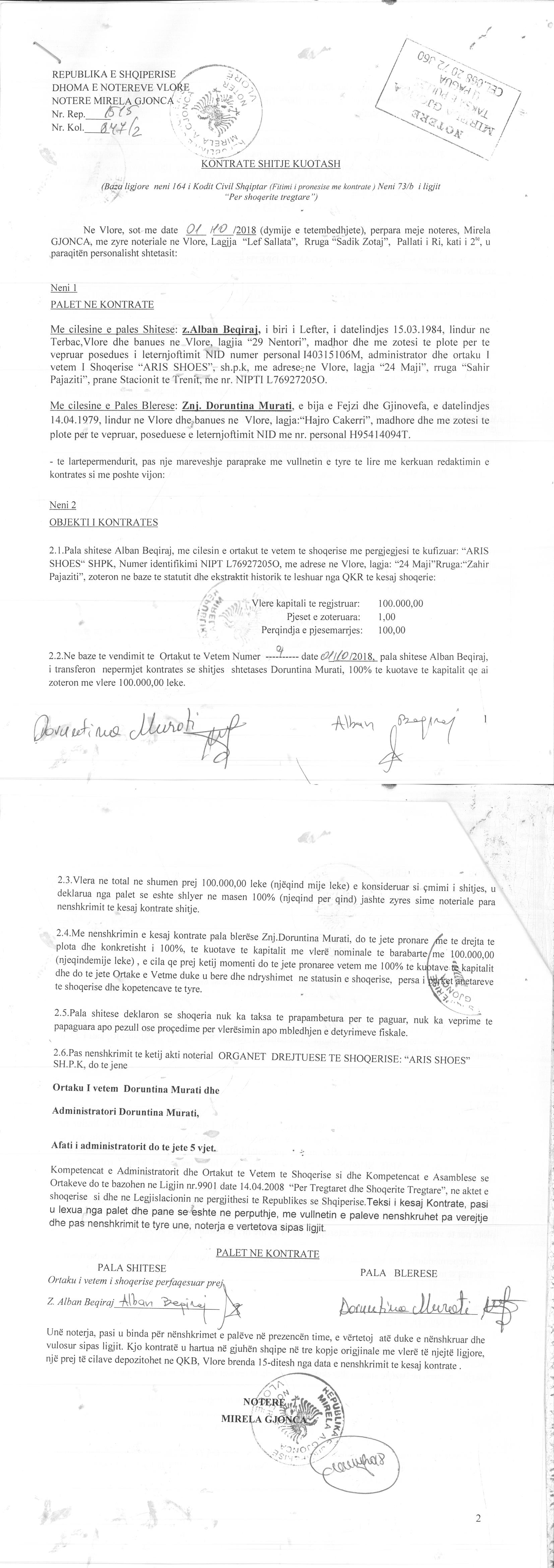 → Ekstrakt Historik i Regjistrit Tregtar, date 23.01.2023 → Akt themelimi i Shoqerise → Kontrate Shitje Kuotash, date 01.10.2018 |