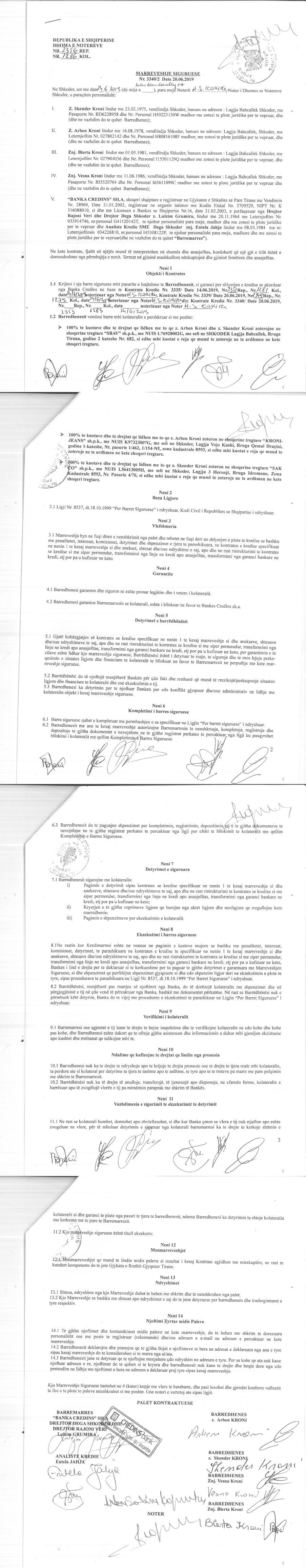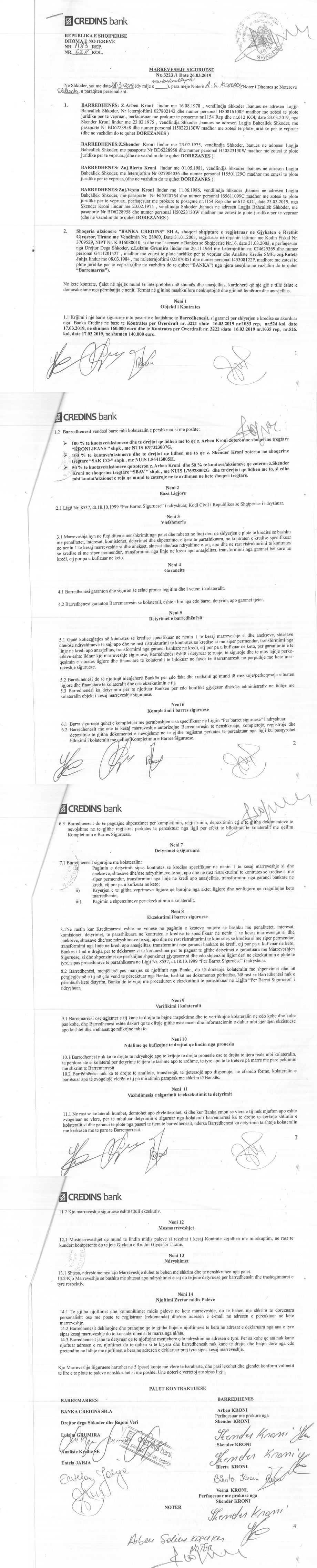 kuotat/aksionet e reja qe mund te zoteroje ne te ardhmen ne kete shoqeri tregtare. II. Me date 24.06.2019, ne baze te m Marreveshjes Siguruese, Nr. 2356 Rep., dhe Nr. 1286 Kol. Lidhur nepermjet barredhenesit Arben Kroni, Skender Kroni, Blerta Kroni, Vesna Kroni dhe barremarresit Banka Credins, per krijimin e nje barre siguruese mbi pasurite e luajtshme te barredhenesit si garanci per kredine qe banka Credins i ka akorduar shoqerise sipas te dhenave ne marreveshje: Barredhenesit vendosin barre mbi kolateralin 100% te kuotave dhe e te drejtave lidhur me to qe z. Arben Kroni dhe z. Skender Kroni zoterojne ne shoqerine SBAV shpk si dhe mbi kuotat/aksionet e reja qe mund te zoteroje ne te ardhmen ne kete shoqeri tregtare. |