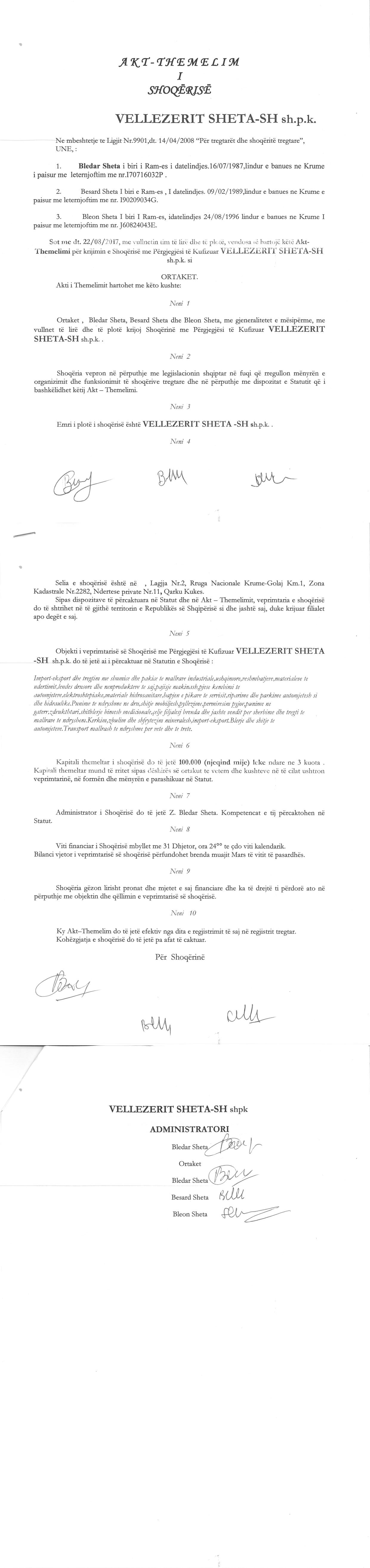 | Emërtime të tjera Tregtare: | VELLEZERIT SHETA -SH |