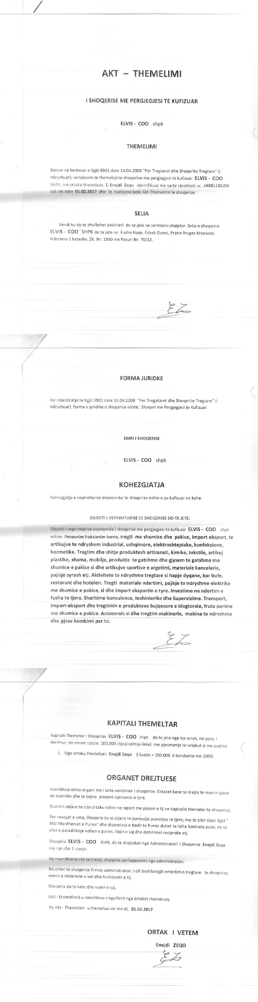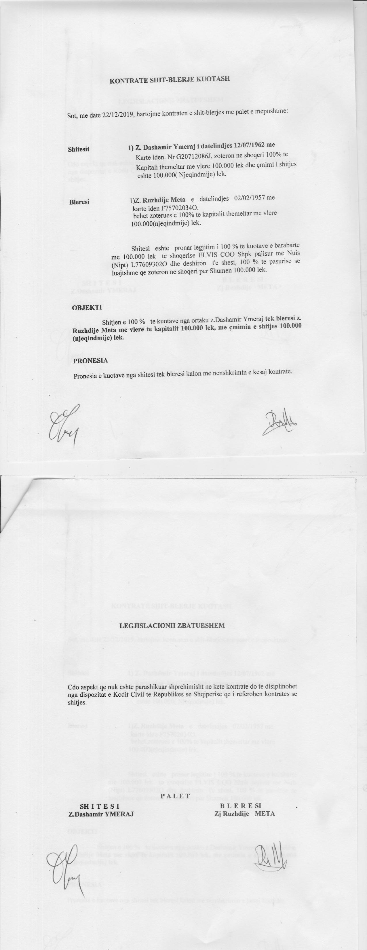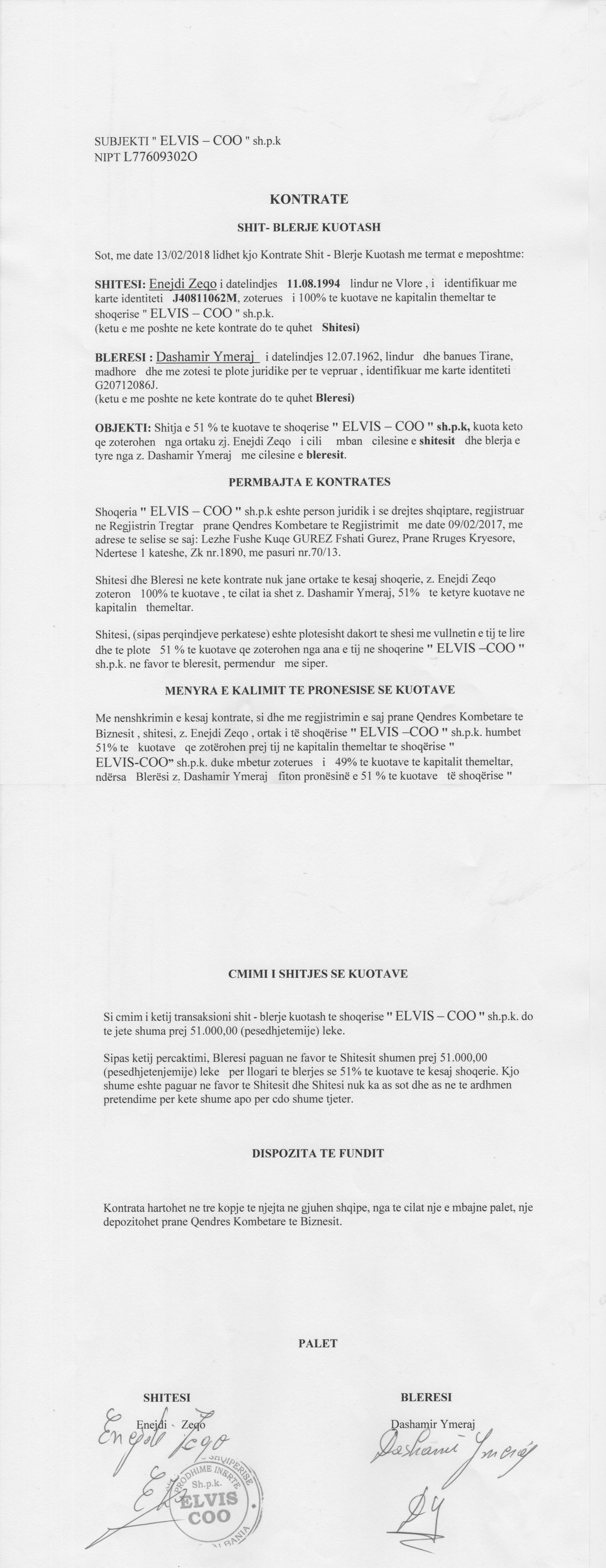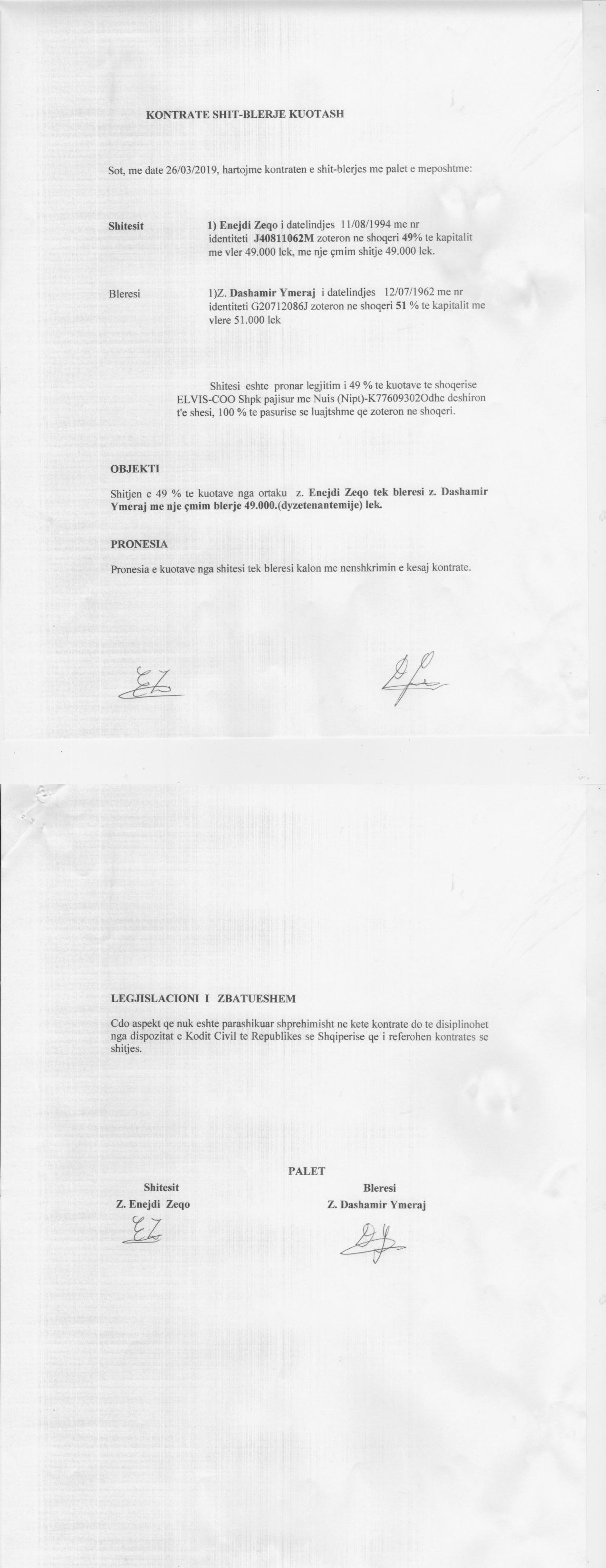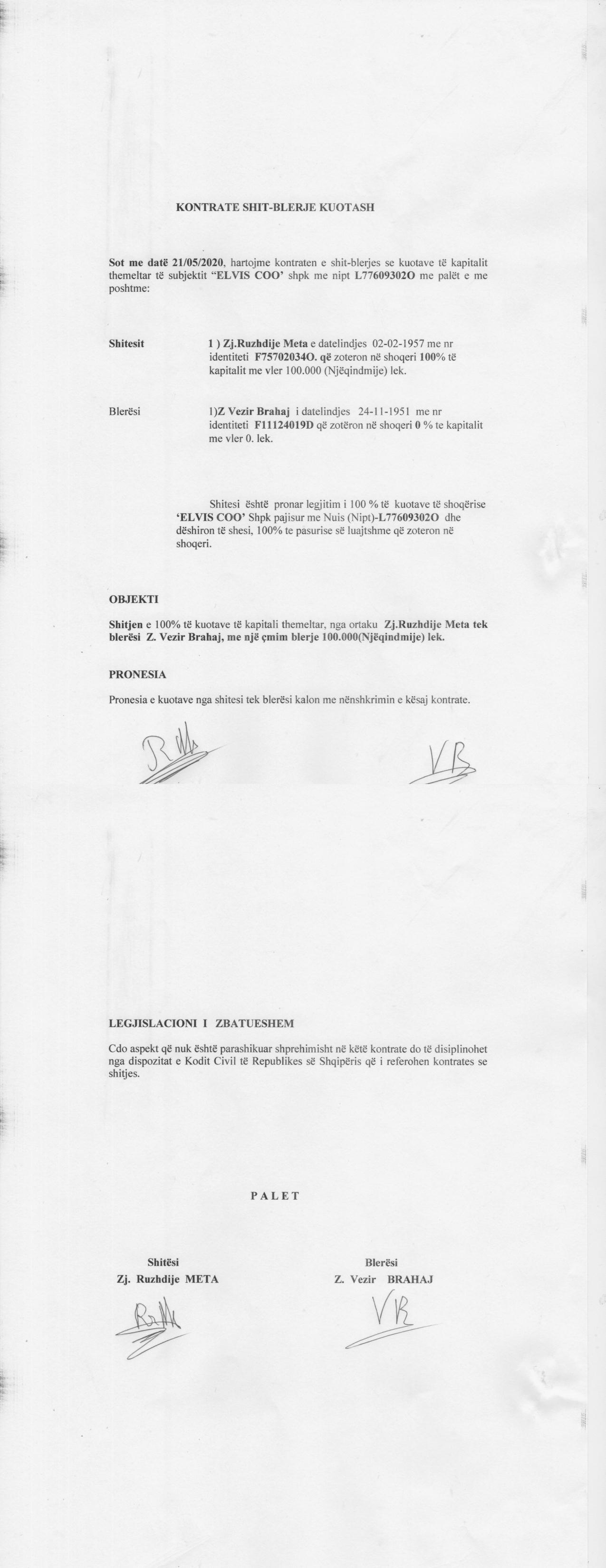→ Ekstrakti Historik i Regjistrit Tregtar date 20.01.2023 → Akt themelimi i Shoqerise → Kontrate Shitblerje Kuotash date 13.02.2018 → Kontrate Shitblerje Kuotash date 26.03.2019 → Kontrate Shitblerje Kuotash date 22.12.2019 → Kontrate Shitblerje Kuotash date 21.05.2020 |
