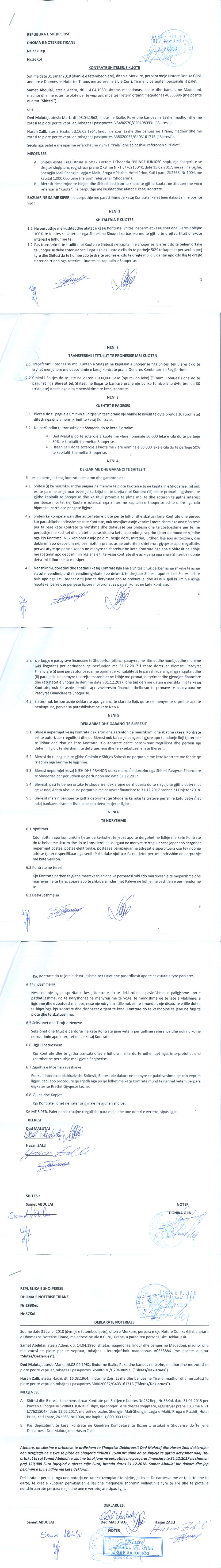 → Ekstrakt Historik i Regjistrit Tregtar date 13.02.2023 → Akt themelimi dhe Statuti i Shoqerise → Kontrate Shitblerje Kuote date 31.01.2018 → Leshimi i Deshmise se Trashegimise Ligjore date 08.04.2021 → Kontrate per Shitjen e Kuotes se Kapitalit date 18.01.2022 → Kontrate per Shitjen e Kuotes se Kapitalit date 31.01.2022 → Urdhër për Vënien e Sekuestros, date 19.12.2022 → Marreveshje Siguruese date 19.04.2022 |