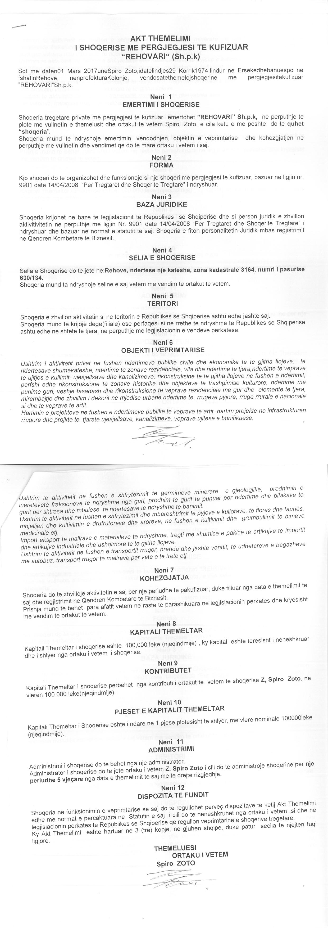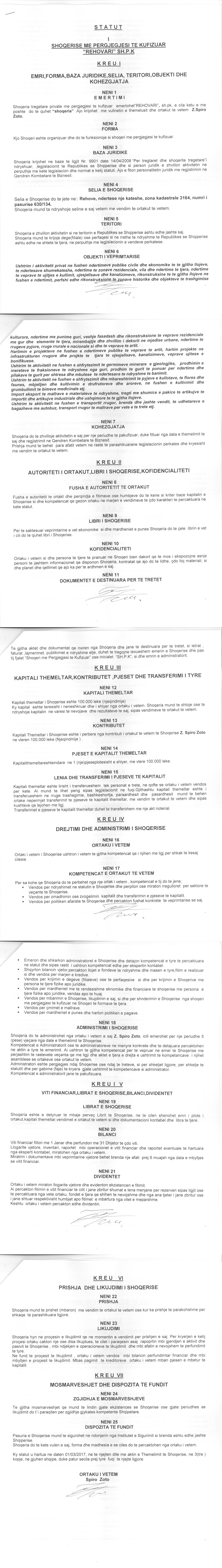 → Ekstrakt Historik i Regjistrit Tregtar, date 15.12.2021 → Akt themelimi , date 01.03.2017 → Statuti i shoqerise, date 01.03.2017 → Urdher per vendosjen e sekuestros, date 24.02.2021 → Urdher per heqjen e sekuestros, date 12.05.2021 |