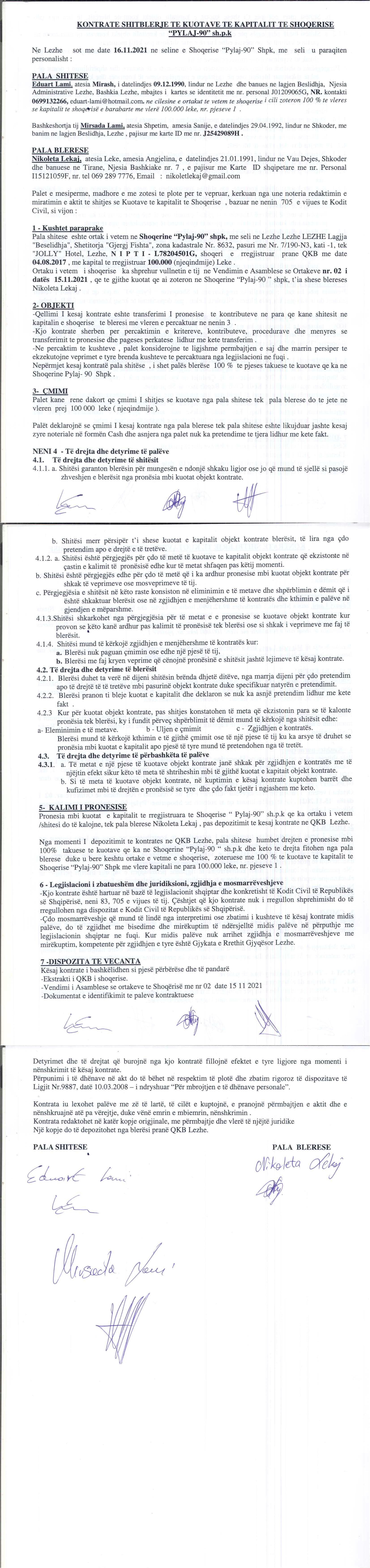 → Ekstrakt Historik i Regjistrit Tregtar date 14.10.2024 → Akt themelimi i Shoqerise → Kontratë Shitblerje të Kuotave të Kapitalit datë 16.11.2021 |