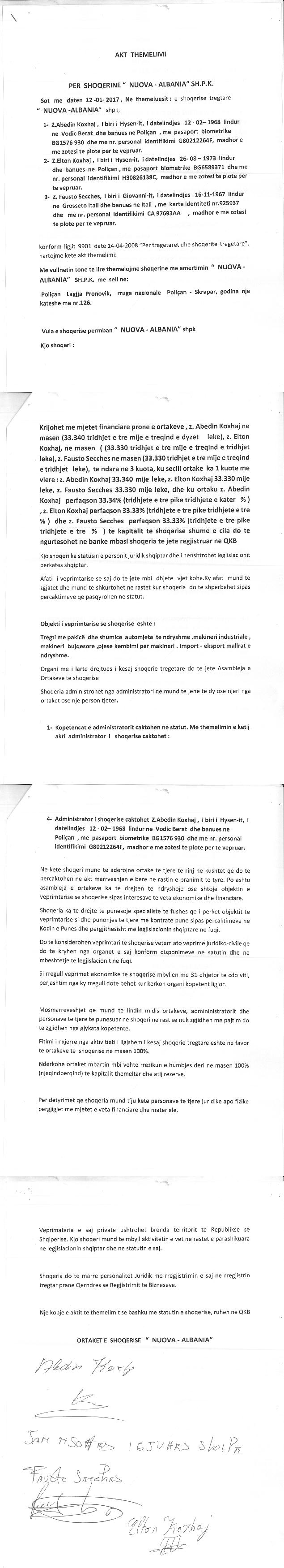 → Ekstrakti Historik i Regjistrit Tregtar date 09.01.2023 → Akt themelimi i Shoqerise → Kontrate Shitblerje Kuotash date 25.04.2019 → Ekstrakti Historik i Regjistrit te Pronareve Perfitues date 09.01.2023 |