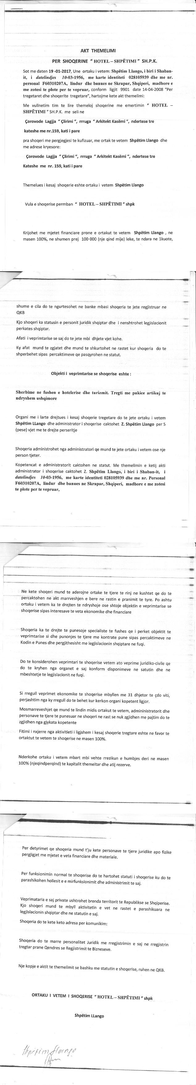 | Objekti i Veprimtarisë: | Sherbime ne fushen e hotelerise dhe turizmit. Dhenie me qira per individe dhe te trete ambjente te objektit zyra etj. |