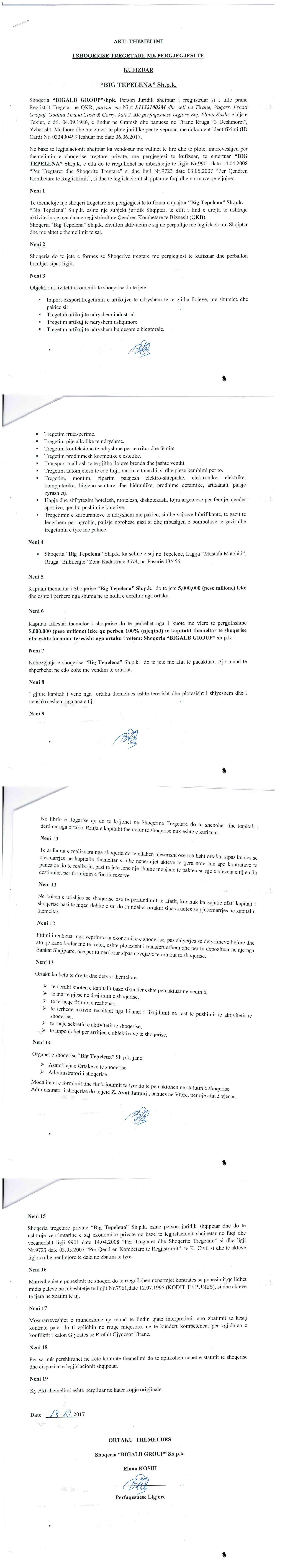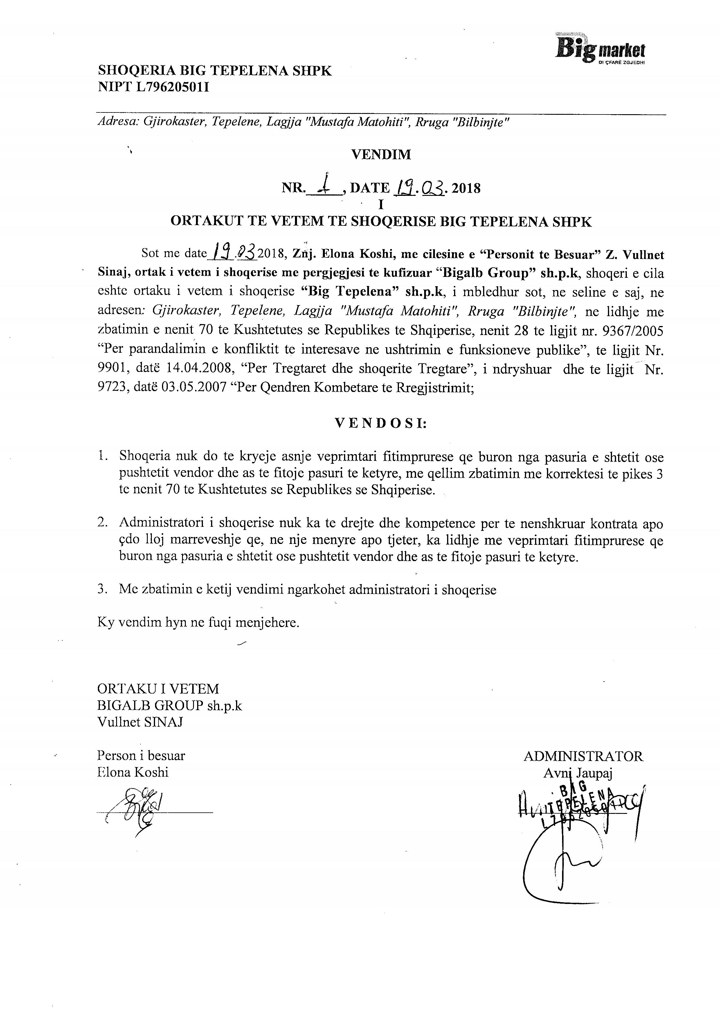 | Shënime: | Kompetencat e Administratorit: Administratori i shoqerise nuk ka te drejte dhe kompetence per te nenshkruar kontrata apo çdo lloj mareveshje qe ne nje menyre apo tjeter ka lidhje me veprimtari fitimprurese qe buron nga pasuria e shtetit ose pushtetit vendor dhe as te fitoj pasuri te ketyre. |
