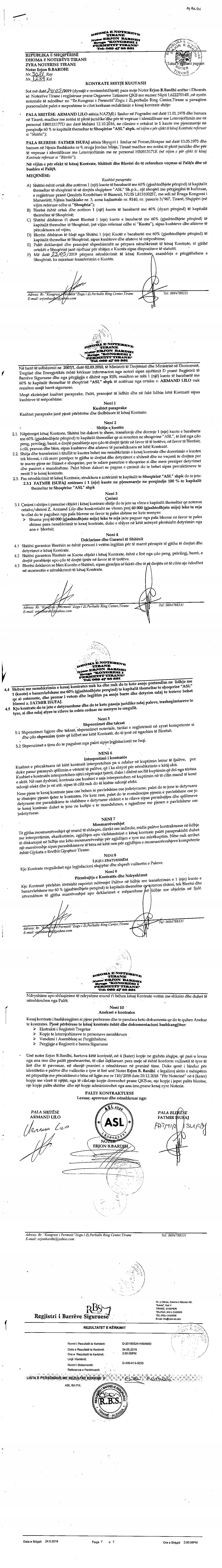 → Ekstrakti Historik i Regjistrit Tregtar date 24.08.2022 → Akt themelimi dhe Statuti i Shoqerise → Kontrate Shitje Kuotash date 06.05.2019 → Kontrate Dhurimi Kuotash date 16.05.2019 → Kontrate Shitje Kuotash date 24.05.2019 → Vendim i Ortakut te Vetem, Zmadhim Kapitali date 10.05.2020 → Vendim i Ortakut te Vetem, Zmadhim Kapitali date 30.06.2021 |