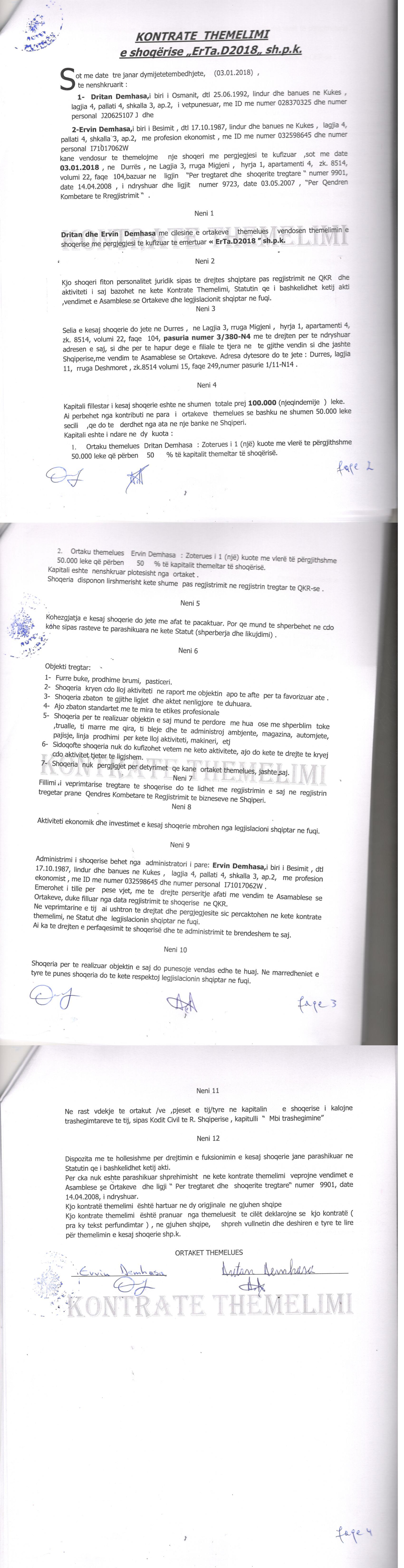 | Objekti i Veprimtarisë: | Furre buke, prodhime brumi, pasticeri. Shoqeria kryen cdo lloj aktiviteti ne raport me objektin apo te afte per te favorizuar ate. Shoqeria zbaton te gjithe ligjet dhe aktet nenligjore te duhura. Ajo zbaton standartet me te mira te etikes profesionale. Shoqeria per te realizuar objektin e saj mund te perdore me hua ose me shperbim toke, trualle, ti marre me qira, ti bleje dhe te administroje ambjente, magazina, automjete, pajisje, linja prodhimi per kete lloj aktiviteti, makineri, etj. Sidoqofte shoqeria nuk do kufizohet vetem ne keto aktivitete, ajo do te kete te drejte te kryej cdo aktivitet tjeter te ligjshem. Shoqeria nuk pergjigjet per detyrimet qe kane ortaket themelues, jashte saj. |
