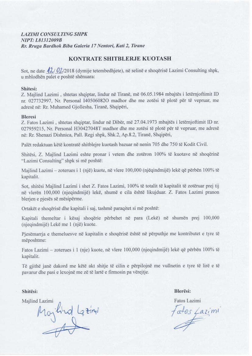 → Ekstrakti Historik i Regjistrit Tregtar date 24.08.2022 → Akt themelimi i Shoqerise → Kontrate Shitblerje Kuotash date 12.02.2018 |