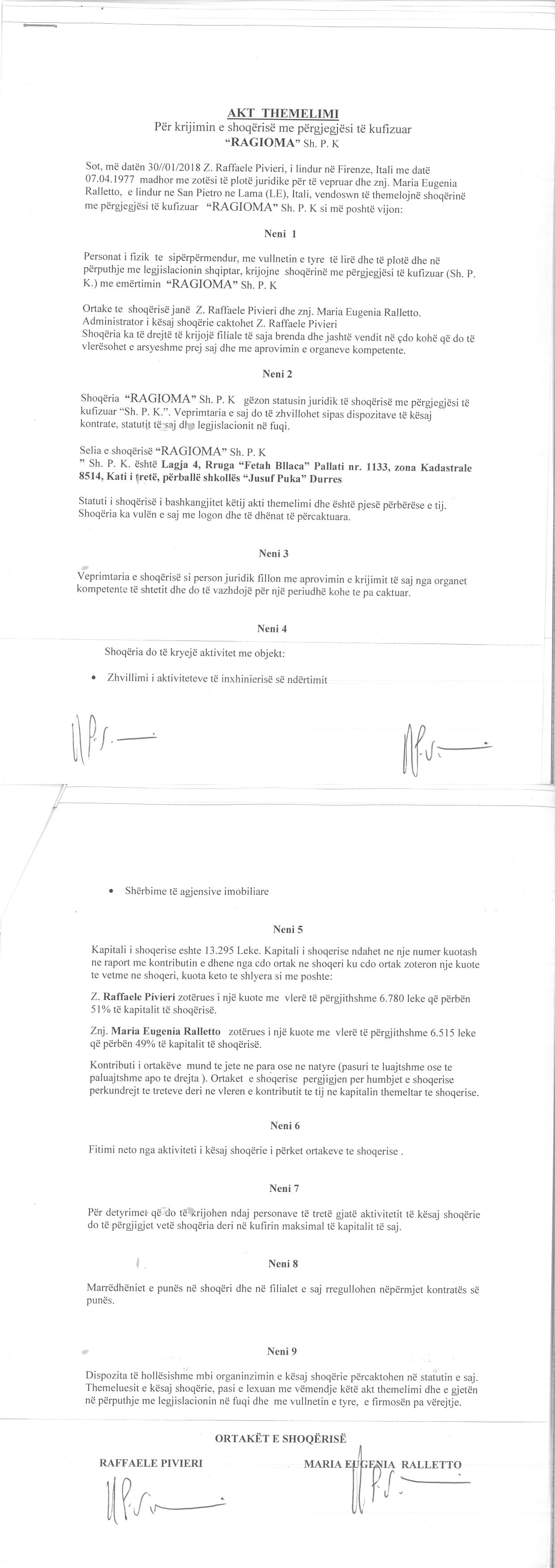 → Ekstrakt Historik i Regjistrit Tregtar date 27.08.2022 → Akt themelimi i Shoqerise → Marreveshje Dhurimi Kuotash date 20.02.2019 → Marreveshje Tr./Shitje Kuotash date 10.03.2022 |