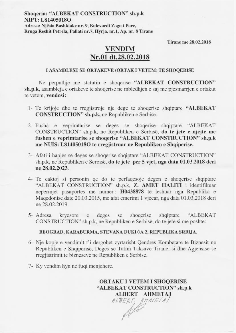 | Shënime: | Hapjen e nje dege te shoqerise ALBEKAT CONSTRUCTION shpk , ne Republiken e Serbise. |