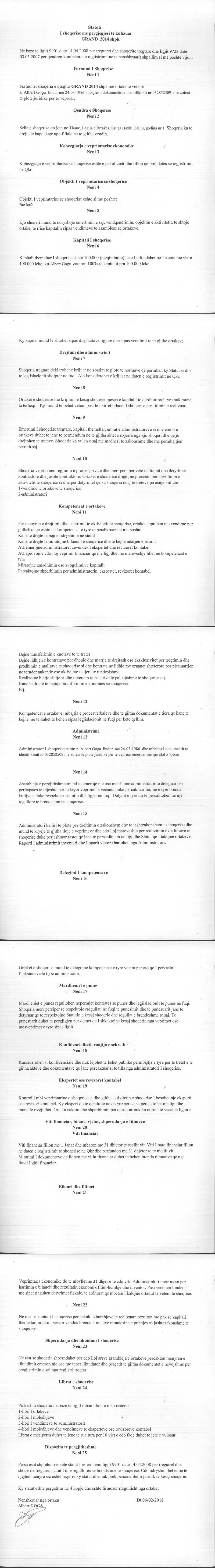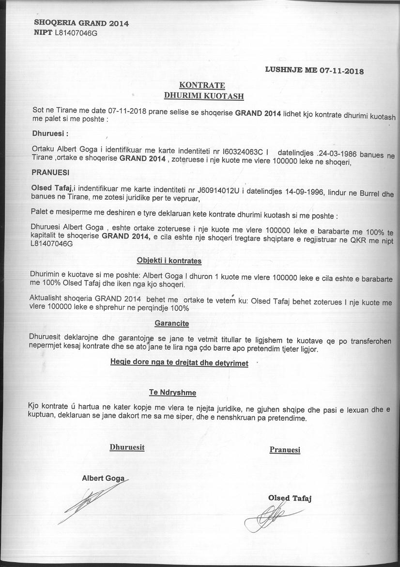 → Ekstrakti Historik I Regjistrit Tregtar date 15.10.2020 → Statuti I Shoqerise → Kontrate e Dhurmit te Kuotave date 07.11.2018 |