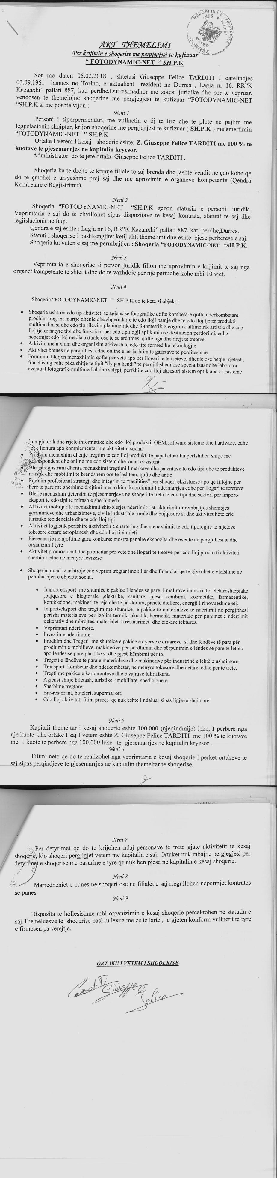 | Objekti i Veprimtarisë: | Shoqeria ushtron cdo tip aktiviteti te agjensise fotografike qofte kombetare qofte nderkombetare prodhim tregtim marrje dhenie dhe shperndarje te cdo lloji pamje dhe te cdo lloj tjeter produkti multimedial si dhe cdo tip rilevim planimetrik dhe fotometrik gjeografik altimetrik artistic dhe cdo lloj tjeter natyre tipi dhe funksioni per cdo tipologji aplikimi ose destincion perdorimi, edhe nepermjet cdo lloj media aktuale ose te se ardhmes, qofte nga dhe drejt te treteve. Arkivim menaxhim dhe organizim arkivash te cdo tipi formed he teknologjie. Aktivitet botues ne pergjithesi edhe online e perjashtim te gazetave te perditeshme. Formimin blerjen menaxhimin qofte per vete apo per llogari te te treteve, dhenie ose heqje rrjetesh, franchising edhe pika shitje te tipit “dyqan kendi” te pergjithshem ose specializuar dhe laborator eventual fotografik-multimedial dhe shtypi, perfshire cdo lloj aksesori sistem optik aparat, sisteme kompjuterik dhe rrjete informatike dhe cdo lloj produkti: OEM,software sisteme dhe hardware, edhe jot e lidhura apo komplementar me aktivitetin social. Prodhim menaxhim dhenje tregtim te cdo lloj produkti te papaketuar ku perfshihen shitje me korrespondent dhe online me cdo sistem dhe kanal ekzistent. Blerja regjistrimi dhenia menaxhimi tregtimi I markave dhe patentave te cdo tipi dhe te produkteve artistik dhe mobilimi te brendshem ose te jashtem, qofte dhe antic. Formim profesional strategji dhe integrim te “facilities” per shoqeri ekzistuese apo qe fillojne per here te pare me sherbime drejtimi menaxhimi koordinimi I ndermarrjes edhe per llogari te tereteve. Blerje menaxhim tjetersim te pjesemarrjeve ne shoqeri te treta te cdo tipi dhe sektori per import-eksport te cdo tipi te mirash e sherbimesh. Aktivitet mobiljar te menaxhimit shit-blerjes ndertimit ristrukturimit mirembajtjes shembjes gerrmimeve dhe urbanizimeve, civile industriale rurale dhe bujqesore si dhe aktivitet hotelerie turistike rezidenciale dhe te cdo lloj tipi. Aktivitet logjistik perfshire aktivitetin e chartering dhe menaxhimit te cdo tipologjie te mjeteve tokesore detare aeroplanesh dhe cdo lloj tipi mjeti. Pjesemarrje ne njoftime gara konkurse mostra panaire ekspozita dhe evente ne pergjithesi si dhe organizim I tyre. Aktivitet promocional dhe publicitar per vete dhe llogari te treteve per cdo lloj produkti aktiviteti sherbimi edhe ne menyre levizese. Shoqeria mund te ushtroje cdo veprim tregtar imobiliar dhe financiar qe te gjykohet e vlefshme ne permbushjen e objektit social. Import eksport me shumice e pakice I lendes se pare ,I mallrave industriale, elektroshtepiake ,bujqesore e blegtorale ,elektrike, sanitare, pjese kembimi, kozmetike, farmaceutike, konfeksione, makineri te reja dhe te perdorura, panele diellore, energji I rinovueshme etj. Import-eksport dhe tregtim me shumice e pakice te materialeve te ndertimit ne pergjithesi perfshi materialeve per izolim termik, akustik, hermetik, materiale per punimet e ndertimit dekorativ dhe mbrojtes, materialet e restaurimet dhe bio-arkitektures. Veprimtari ndertimore. Investime ndertimore. Prodhim dhe Tregeti me shumice e pakice e dyerve e dritareve si dhe lëndëve të para për prodhimin e mobilieve, makinerive për prodhimin dhe përpunimin e lëndës se pare te letres apo lendes se pare plastike si dhe pjesë këmbimi për to. Tregeti e lëndëve të para e materialeve dhe makinerive për industrinë e lehtë e ushqimore. Transport kombetar dhe nderkombetar, ne menyre tokesore dhe detare, edhe per te trete. Tregti me pakice e karburanteve dhe e vajrave lubrifikant. Agjensi shitje biletash, turistike, imobiliare, spedicionere. Sherbime tregtare. Bar-restorant, hoteleri, supermarket. Cdo lloj aktiviteti fitim prures qe nuk eshte I ndaluar sipas ligjeve shqiptare. |