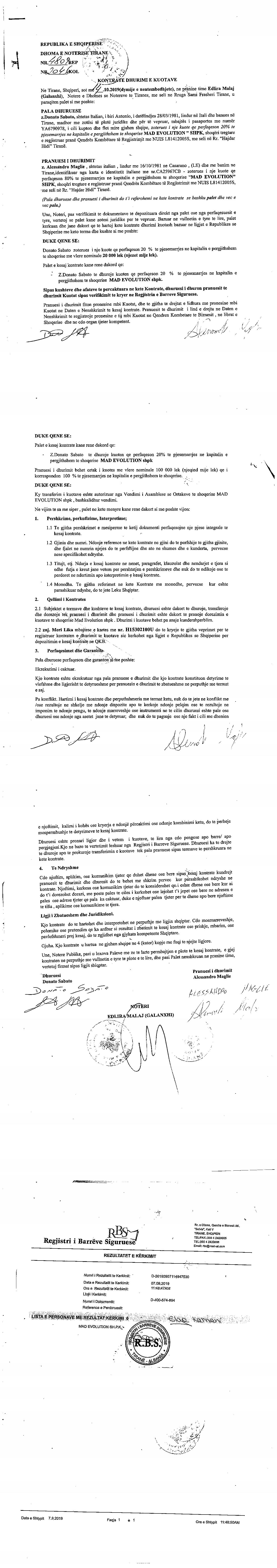 → Ekstrakt Historik i Regjistrit Tregtar date 30.08.2022 → Akt themelimi dhe Statuti i Shoqerise → Kontrate Dhurimi Kuotash date 11.03.2019 → Kontrate Dhurimi Kuotash date 14.10.2019 |