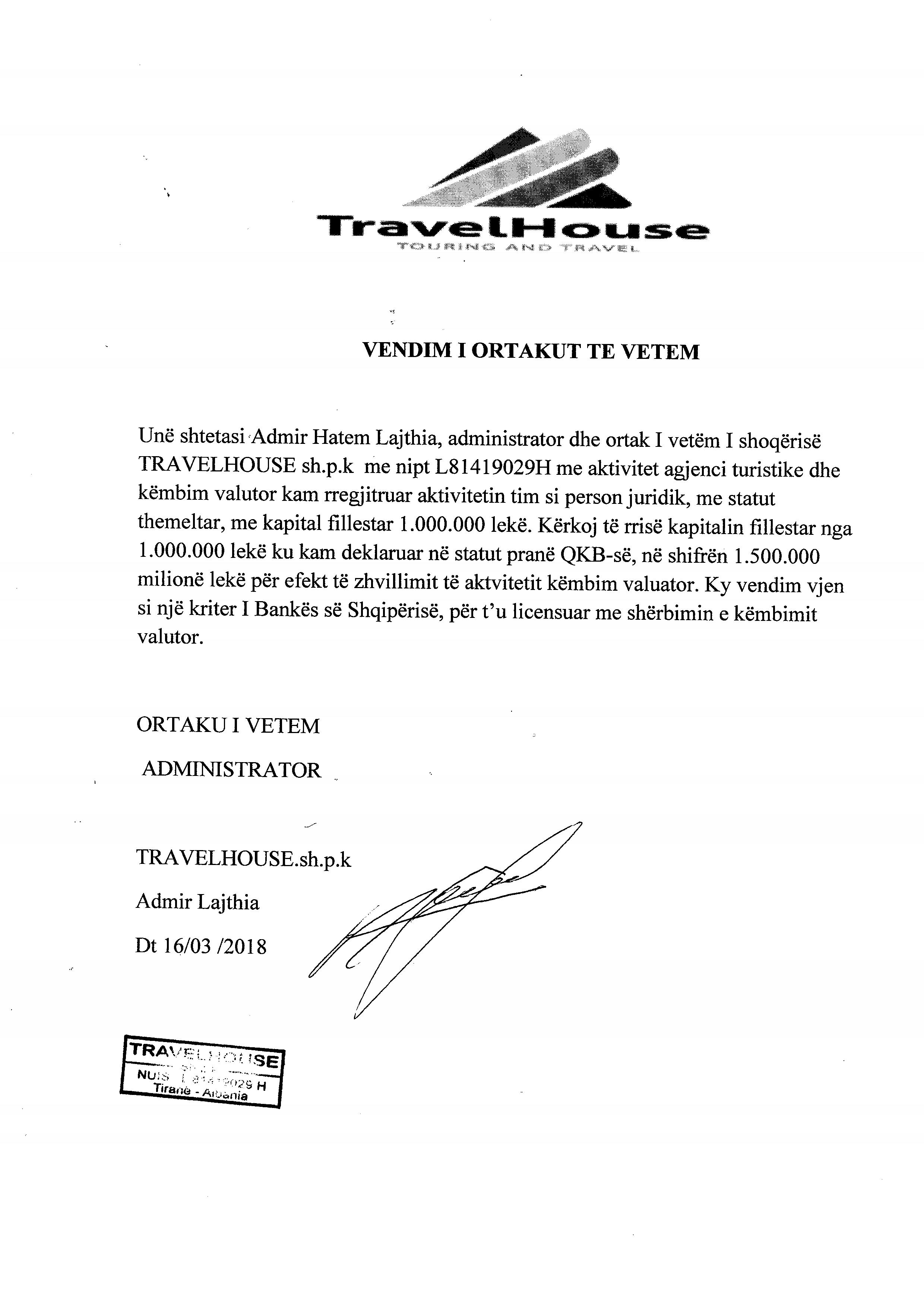 | Objekti i Veprimtarisë: | Ne fushen e Agjensise Turistike, lmobilare, Kembim Valutor, Pagesave te Faturave per kryerjen e veprimeve me te tretet. Hoteleri. Ne fushen e tregtise Import Eksport te mallrave te ndryshme bujqesore blektorale e industriale dhe kryesisht te materialeve Parukerie dhe estetike. Ne fushen e sherbimit te transportit te udhetareve dhe mallrave,servis, parking automjetesh Lavazh. Ne fushen e agjesisve te shitblerjes dhe dhenies me qera te pasurive te lujtshme e te palujatshme. Agjent i Shoqerise EasyPay Sh.p.k. (Institution i Parase Elektronike) per kryerjen e sherbimeve qe perfshijne por nuk kufizohen ne pagesa faturash, shitje te mallrave/ sherbimeve te partnereve te EasyPay, rimbushje elektronke etj. |