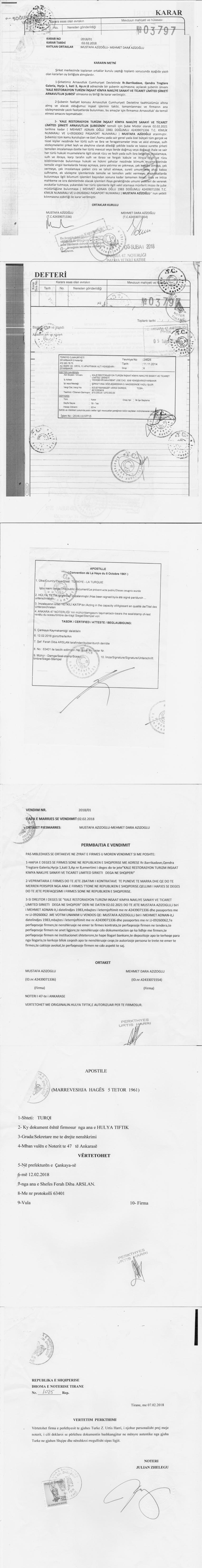 | Emërtime të tjera Tregtare: | KALE RESTORASYON TURIZM INSAAT KIMYA NAKLIYE SANAYI VE TICARET LIMITED SIRKETI |