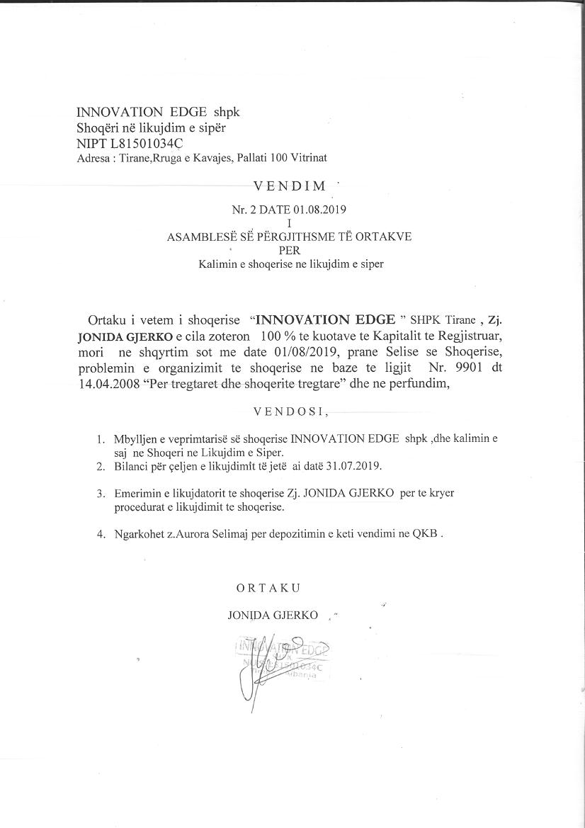 → Ekstrakt Historik i Regjistrit Tregtar date 09.09.2022 → Akt themelimi i Shoqerise → Vendim i Ortakut te Vetem, Likuidim Shoqerie date 01.08.2019 → Akt Likuidimi i Shoqerise → Vendim i Ortakut te Vetem, Cregjistrim Shoqerie date 25.05.2020 |