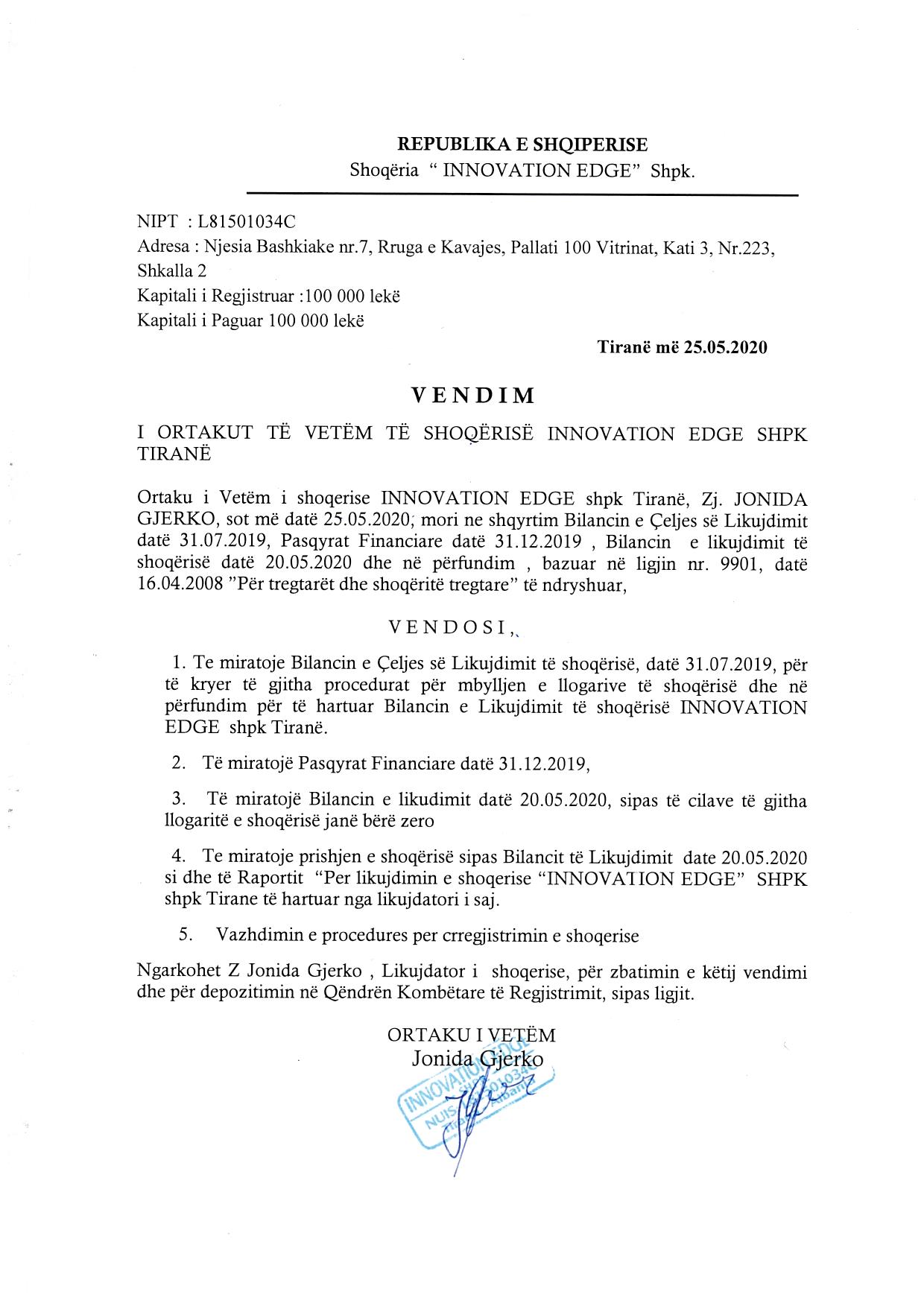 | Çështje Ligjore: | I. Me date 01.08.2019, me vendim te ortakut te vetem, u vendos : Kalimi i Shoqerise ne Likujdim e Sipër. Statusi i Shoqerise kalon nga "Aktiv " ne "Shoqeri ne Likuidim e Siper" II. Me date 25.05.2020, me vendim te ortakut te vetem, u vendos : Cregjistrim i Shoqerise. Statusi i Shoqerise kalon nga "Shoqeri ne Likuidim e Siper" ne "Çregjistruar" |