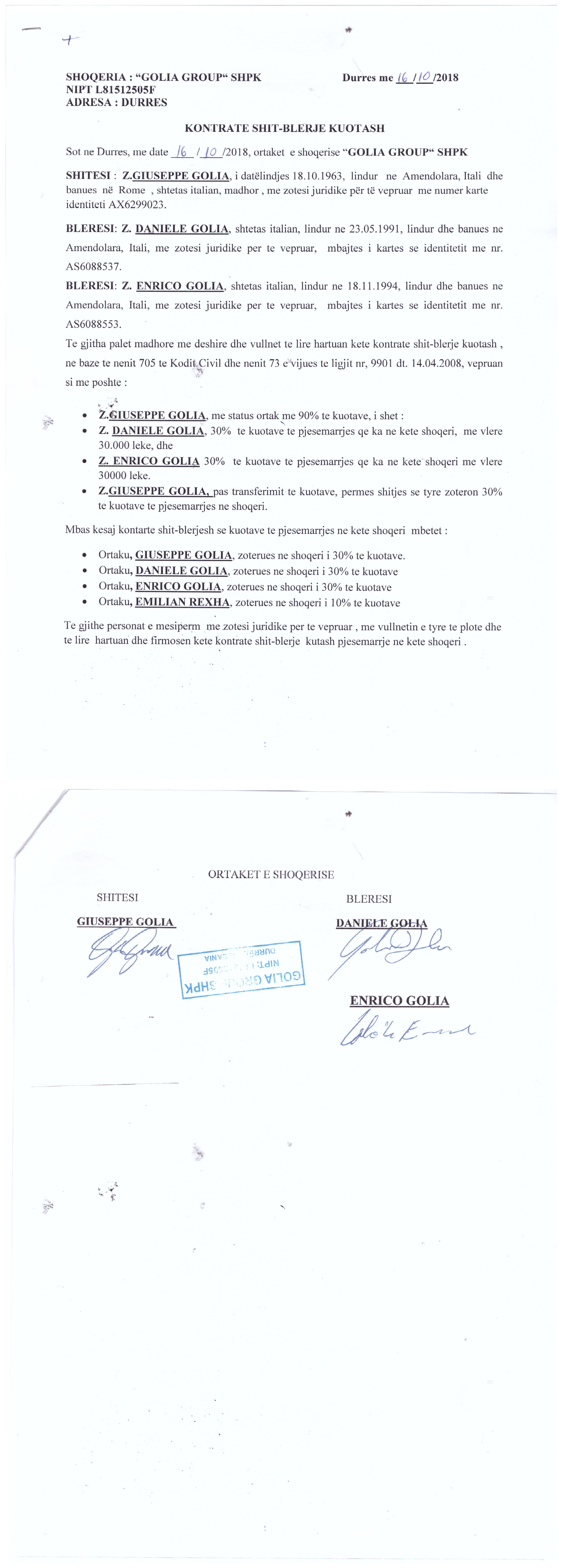 → Ekstrakti Historik i Regjistrit Tregtar date 14.09.2022 → Akt themelimi i Shoqerise → Kontrate Shitblerje Kuotash date 16.10.2018 |