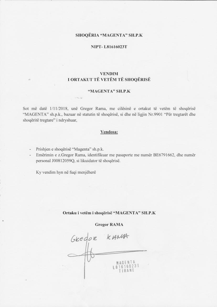 | Çështje Ligjore: | I.Sipas vendimit te ortakut te vetem te shoqerise date 01.11.2018, eshte ndryshuar statusi i shoqerise nga aktiv ne Shoqeri ne Likuidim e Siper. II. Sipas vendimit te ortakut te vetem te shoqerise date 11.01.2019, eshte ndryshuar statusi i shoqerise nga Shoqeri ne Likuidim e Siper ne te çregjistruar. |