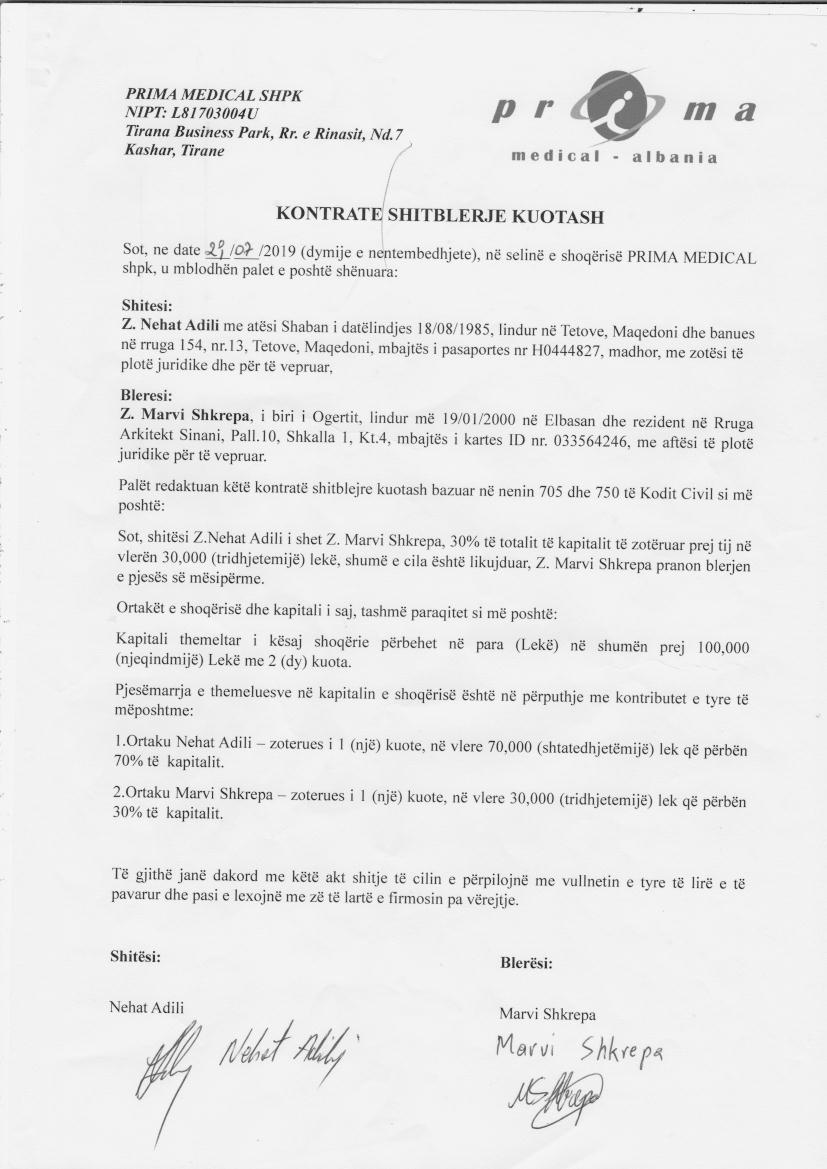 → Ekstrakt Historik i Regjistrit Tregtar, date 23.12.2021 → Akt themelimi, statuti i shoqerise, date 30.04.2018 → Vendimi i asamblese se ortakeve, date 16.07.2019 → Kontrate e shitjes se kuotave, date 29.07.2019 → Vendimi i Asamblese se ortakeve, date 26.2.2020 → Vendimi i asamblese se ortakeve, date 18.05.2020 → Kontrate e shitjes se kuotave, date 03.06.2021 |