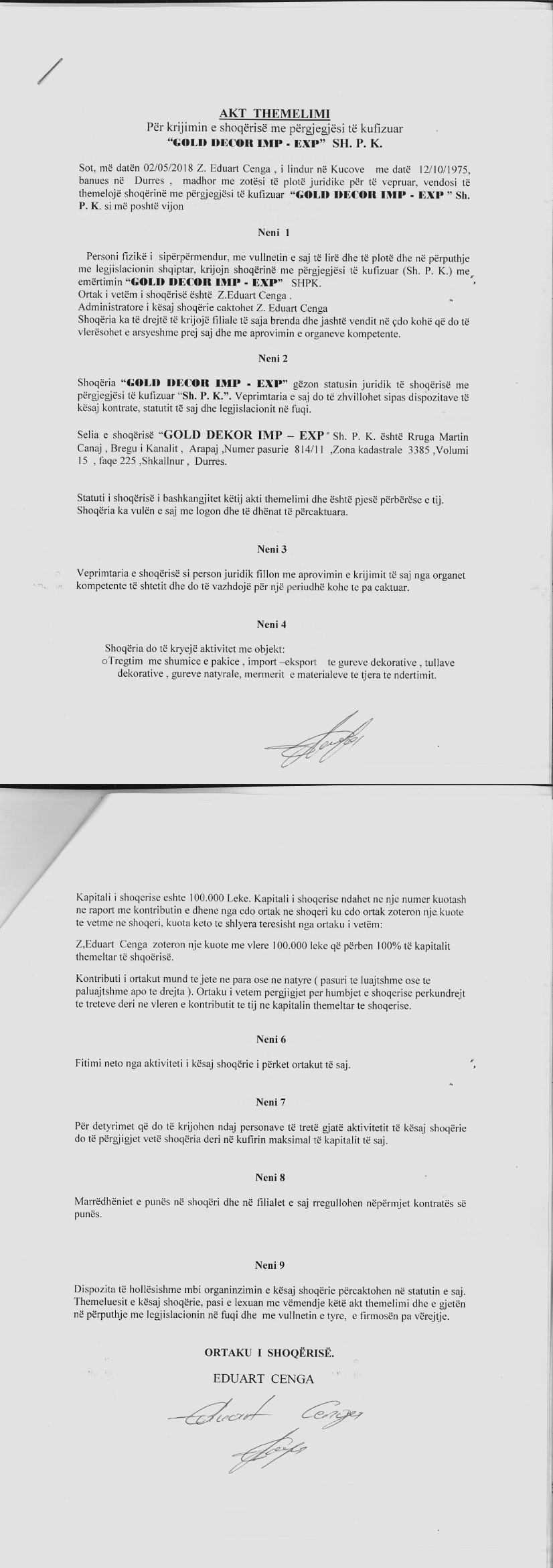 | Objekti i Veprimtarisë: | Tregtim me shumice e pakice, import-eksport te gureve dekorative, tullave dekorative, gureve natyrale, mermerit e materialeve te tjera te ndertimit. Punime te sipermarrjes te ndertimit, ne ndertim objektesh banimi apo sherbimi, shtrim rrugesh apo trotuaresh, sistemim dhe shtrim te ambienteve te jashtme dhe lulishteve. Aktivitet ne fushen imobiliare. |