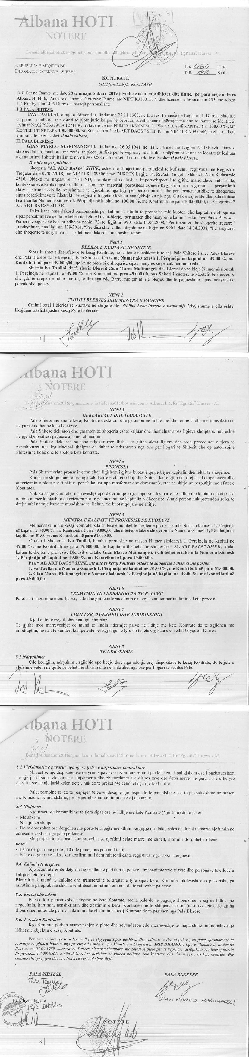 → Ekstrakti Historik I Regjistrit Tregtar date 13.10.2022 → Akt themelimi i Shoqerise → Kontrate Shitblerje Kuotash, date 28.02.2019 |