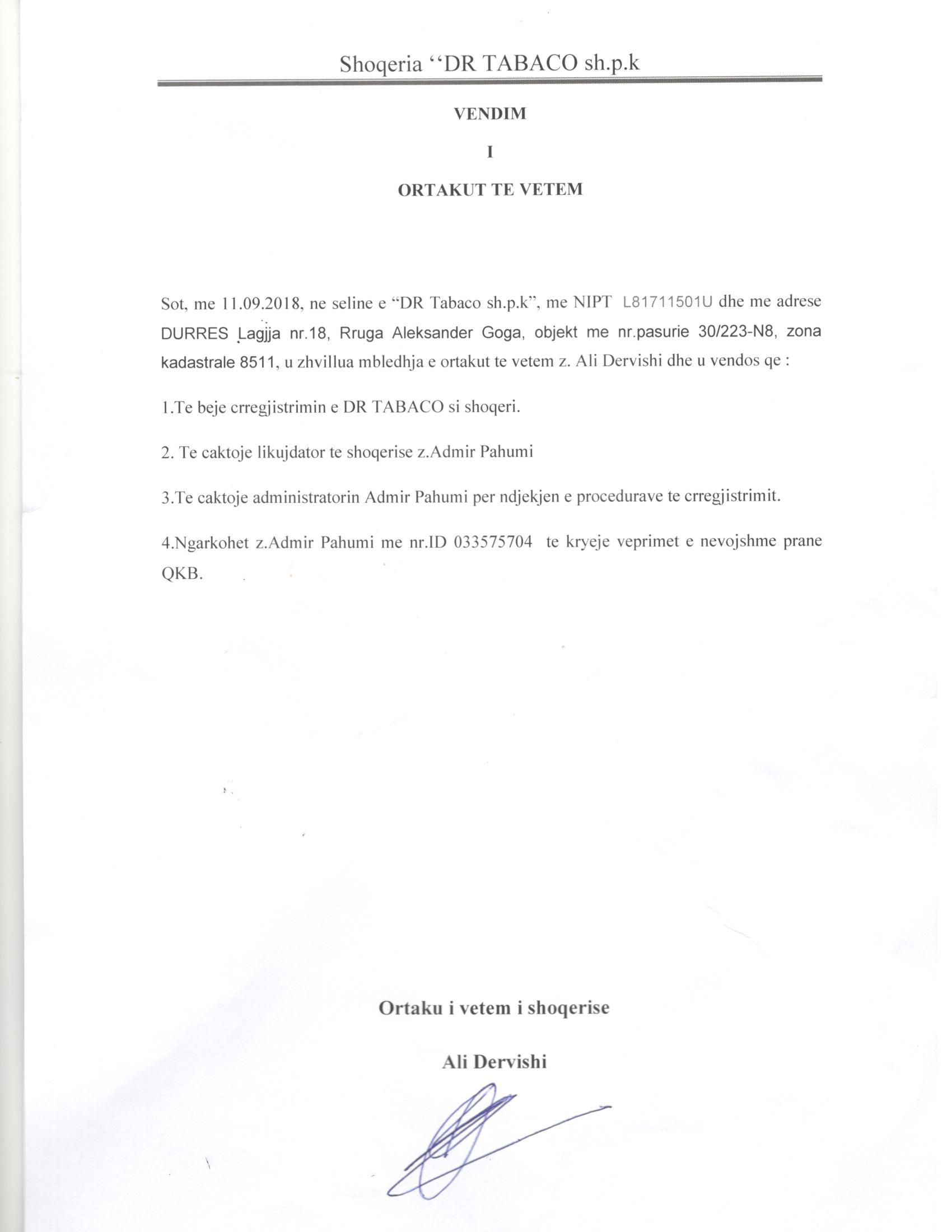 → Ekstrakti Historik i Regjistrit Tregtar date 15.10.2022 → Statuti i Shoqerise → Vendim i Ortakut te Vetem, Likuidim Shoqerie date 11.09.2018 |