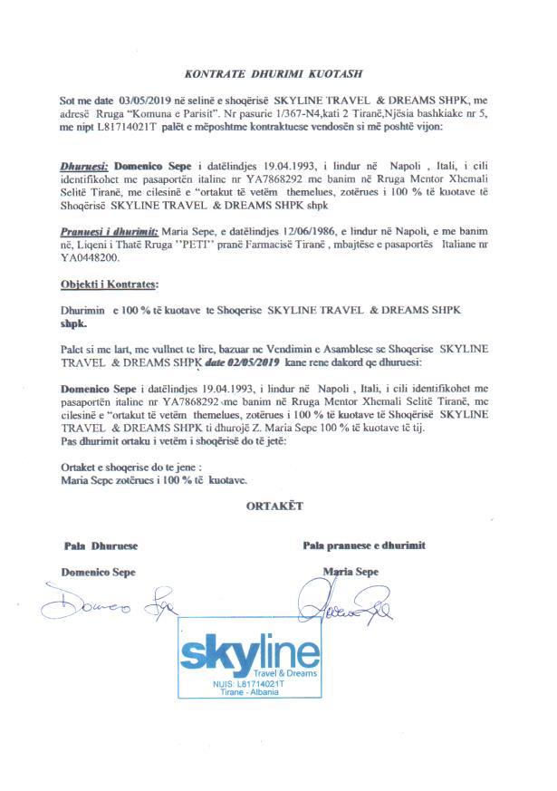 → Ekstrakti Historik I Regjistrit Tregtar date 13.10.2022 → Akt themelimi i Shoqerise → Kontrate Dhurimi Kuotash, date 03.05.2019 |