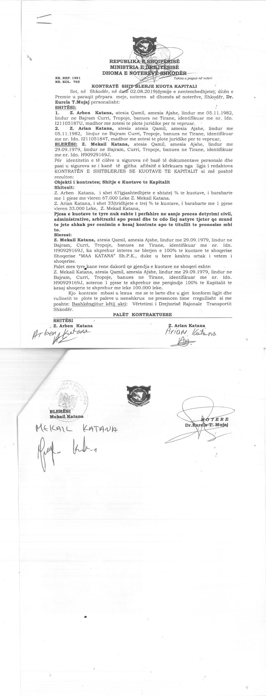 → Ekstrakt Historik i Regjistrit Tregtar date 21.10.2022 → Akt themelimi dhe Statuti i Shoqerise → Kontrate Shitblerje Kuotash date 08.06.2018 → Kontrate Shitblerje Kuotash date 02.08.2019 |
