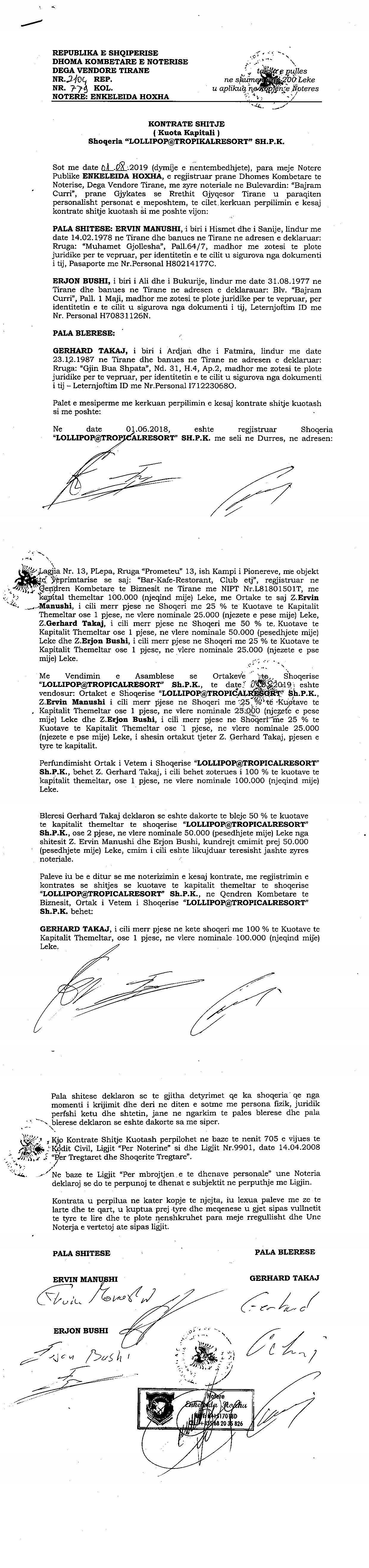 | Çështje Ligjore: | I. Me date 12.10.2018, me vendim te asamblese se ortakeve, u vendos: Pezullim i Aktivitetit. Statusi i Shoqerise kalon nga "Aktiv" ne "Pezulluar" II. Me date 06.06.2019, me kerkese te administratorit te shoqerise, u kerkua: Aktivizim i Aktivitetit. Statusi i Shoqerise kalon nga "Pezulluar" ne "Aktiv" III. Me date 14/08/2020, me ane te Marrëveshjes Siguruese Nr.2665 Rep., Nr. 1411 Kol, datë 15.07.2020, e lidhur midis shoqërisë “LOLLIPOP@TROPIKALRESORT” sh.p.k., (barrëdhënësi) dhe shoqërisë “BANKA AMERIKANE E INVESTIMEVE” sh.a., (barrëmarrësi), me objekt: Krijimi i një barre siguruese mbi pasuritë e luajtshme të barrëdhënësit, si garanci për kredinë e akorduar nga “BANKA AMERIKANE E INVESTIMEVE” sh.a, mbi objektin e mëposhtëm: Barrëdhënësi shoqëria “LOLLIPOP@TROPIKALRESORT” sh.p.k., vendos barrë mbi 100 % të kuotave që z. Gerhard Takaj zotëron në shoqërinë “LOLLIPOP@TROPIKALRESORT” sh.p.k. III. Me date 11.06.2021, me vendim te ortakut te vetem, u vendos: Pushim i Perkohshem i Aktivitetit. Statusi i Shoqerise kalon nga "Aktiv" ne "Pezulluar" |