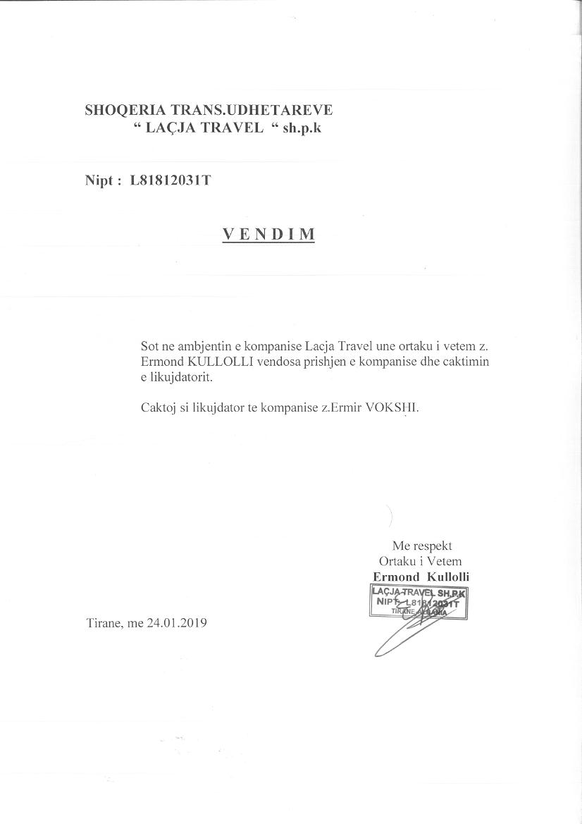 → Ekstrakt Historik i Regjistrit Tregtar date 26.10.2022 → Statuti i Shoqerise → Vendim i Ortakut te Vetem, Likuidim Shoqerie date 24.01.2019 |