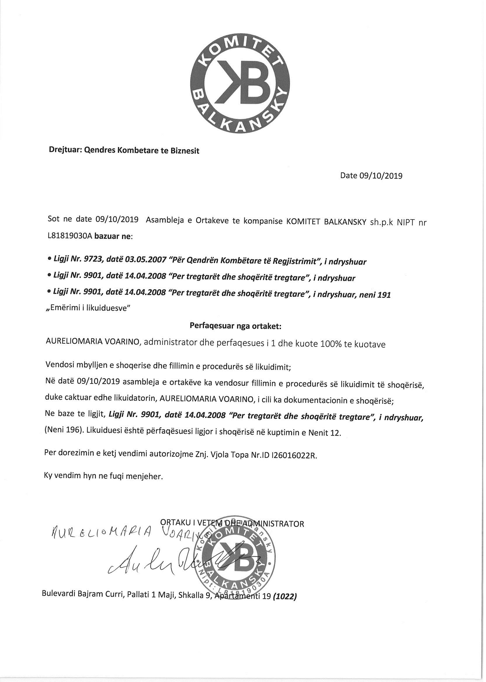 → Ekstrakt Historik i Regjistrit Tregtar date 27.10.2022 → Statuti i Shoqerise → Vendim i Ortakut te Vetem, Likuidim Shoqerie date 09.10.2019 → Ekstrakt Historik i Regjistrit te Pronarve Perfitues date 27.10.2022 |