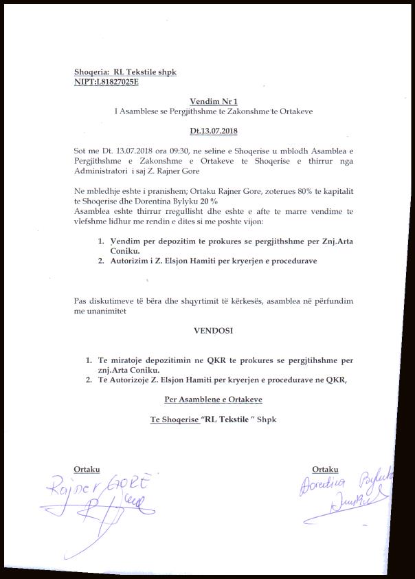 | Çështje Ligjore: | I. Me date 06/08/2018, me ane te Vendimit te Asamblese dt. 13.07.2018, u vendos depozitimi Prokures se Pergjithshme Nr.1829 Rep., dhe Nr. 730 Kol., me objekt