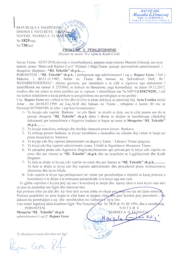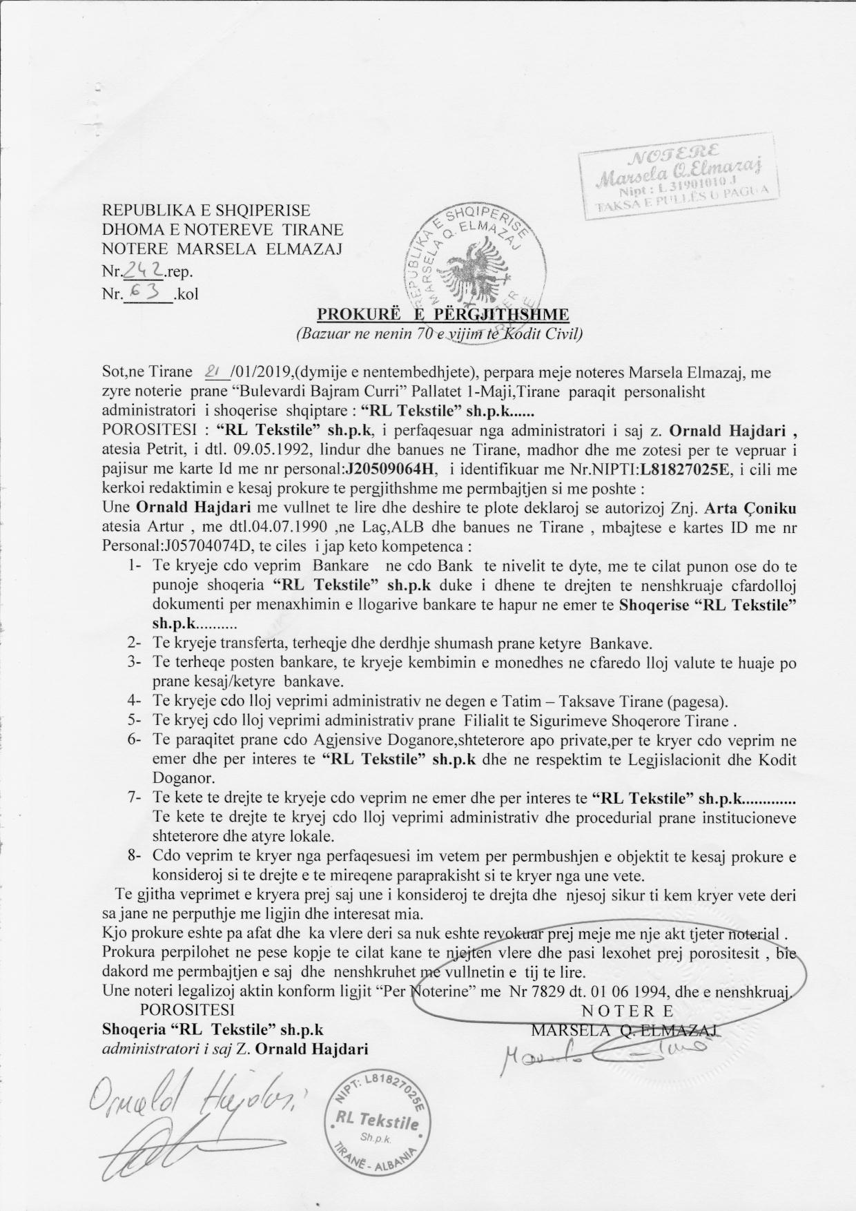bankare sipas te dhenave ne prokure. II. Me date 24/01/2019, me ane te Prokurës së Përgjithshme Nr.242 Rep., Nr. 63Kol., datë 21.01.2019, nëpërmjet së cilës shoqëria “RL Tekstile” sh.p.k., përfaqësuar nga Administratori i saj Z. Ornald Hajdari, i jep kompetencë Znj. Arta Çoniku që ta përfaqësojë në bazë të tagrave që i lejon kjo prokurë. III. Me date 14/07/2021, me ane te Kerkeses Nr. 6865 Prot., date 05.07.2021, leshuar nga Drejtoria e Mbledhjes se Detyrimeve Tatimore te Papaguara Rajoni Qendror Tirane, per vendosjen e mases se sigurimit te detyrimit tatimor mbi pasurite e tatimpaguesit RL Tekstile SHPK, me NUIS (NIPT) L81827025E dhe mos lejimin e tjetersimit te pasurise dhe te drejtave te tjera pasurore, deri ne shlyerjen e plote te detyrimeve tatimore. IV. Me date 08/08/2022, me ane te Kerkeses Nr. 21732 Prot., date 02.08.2022, leshuar nga Drejtoria e Mbledhjes se Detyrimeve Tatimore te Papaguara Rajoni Qendror Tirane, per lirimin e mases se sigurimit te detyrimit tatimor mbi pasurite e tatimpaguesit RL Tekstile SHPK, me NUIS (NIPT) L81827025E, pasi subjekti ka paguar te gjitha detyrimet. V. Me datë 27.07.2023, me anë të shkresës Nr. 42576 Prot, për Vendosje të Masës së Sigurimit të Detyrimit Tatimor, lëshuar nga Drejtoria e Përgjithshme e Tatimeve, Rajoni Qëndror, u kërkua: Vendosja e masës së sigurimit të detyrimit tatimor, mbi tatimpaguesin shoqëria “ RL Tekstile ” SH.P.K., pajisur me NUIS (Nipt)- L81827025E. Vendosja e kësaj masë synon të moslejohet tjetërsimi i titujve të pronësisë dhe të drejtat pasurore që i përkasin këtij tatimpaguesit deri në shlyerjen e detyrimeve tatimore. VI. Me datë 27.07.2023, me anë të shkresës Nr. 42576 Prot, për Vendosje të Masës së Sigurimit të Detyrimit Tatimor, lëshuar nga Drejtoria e Përgjithshme e Tatimeve, Rajoni Qëndror, u kërkua: Vendosja e masës së sigurimit të detyrimit tatimor, mbi tatimpaguesin shoqëria “ RL Tekstile ” SH.P.K., pajisur me NUIS (Nipt)- L81827025E. Vendosja e kësaj masë synon të moslejohet tjetërsimi i titujve të pronësisë dhe të drejtat pasurore që i përkasin këtij tatimpaguesit deri në shlyerjen e detyrimeve tatimore. VII. Me datë 27.07.2023, me anë të shkresës Nr. 42576 Prot, për Vendosje të Masës së Sigurimit të Detyrimit Tatimor, lëshuar nga Drejtoria e Përgjithshme e Tatimeve, Rajoni Qëndror, u kërkua: Vendosja e masës së sigurimit të detyrimit tatimor, mbi tatimpaguesin shoqëria “ RL Tekstile ” SH.P.K., pajisur me NUIS (Nipt)- L81827025E. Vendosja e kësaj masë synon të moslejohet tjetërsimi i titujve të pronësisë dhe të drejtat pasurore që i përkasin këtij tatimpaguesit deri në shlyerjen e detyrimeve tatimore. VIII. Me datë 27.07.2023, me anë të kerkeses nr.42163 prot, per vendosjen e mases se sigurimit te detyrimit tatimor per subjektin RL Tekstile shpk (Rajoni Qendror), u kërkua: Vendosja e masës së sigurimit të detyrimit tatimor, mbi tatimpaguesin shoqëria “ RL Tekstile ” SH.P.K., pajisur me NUIS (Nipt)- L81827025E. |