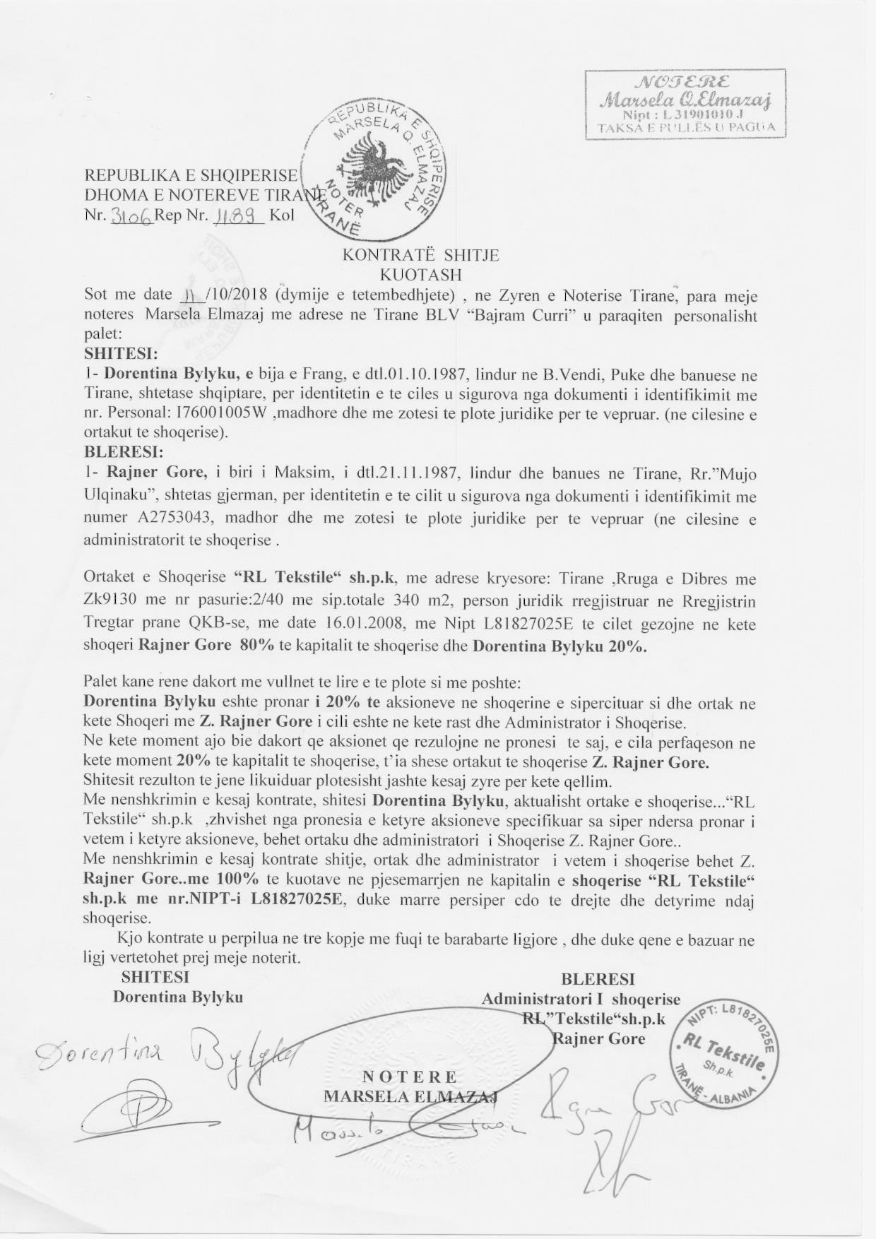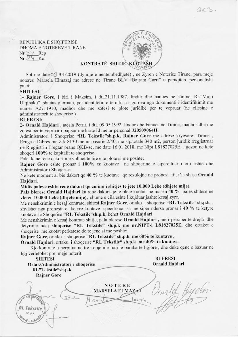 → Ekstrakt Historik i Regjistrit Tregtar date 29.10.2022 → Akt themelimi i Shoqerise → Vendim i Asamblese se Ortakeve, Prokure e Pergjithshme date 13.07.2018 → Prokure e Pergjithshme → Kontrate Shitje Kuotash date 11.10.2018 → Kontrate Shitje Kuotash date 09.01.2019 → Prokure e Pergjithshme → Kontrate Shitje Kuotash date 16.08.2022, → Ekstrakt Historik i Regjistrit Tregtar date 24.05.2024 → Kontratë Shitje Kuote Kapitali datë 15.05.2023 |