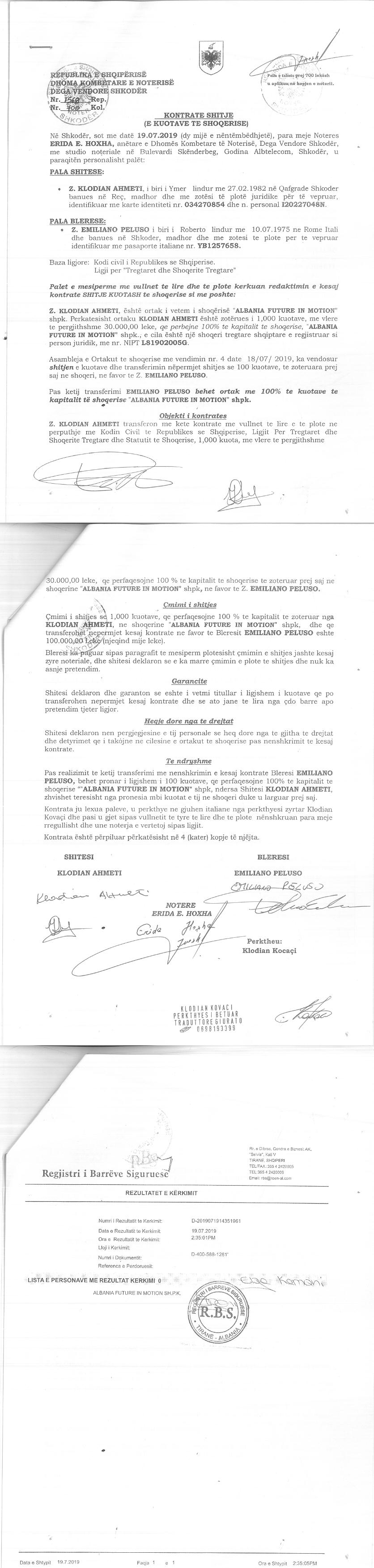 → Ekstrakt Historik i Regjistrit Tregtar date 02.11.2022 → Akt themelimi dhe Statuti i Shoqerise → Kontrate Shitje Kuotash date 19.07.2019 → Ekstrakt Historik i Regjistrit te Pronareve Perfitues date 02.11.2022 |