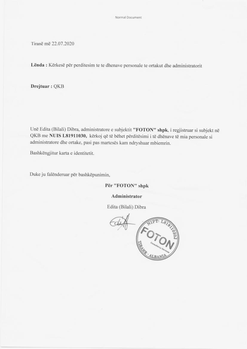| Çështje Ligjore: | Me date 22.07.2020, eshte ndryshuar mbiemri i administratores dhe ortakes se vetme te shoqerise nga Edita Bilali në Edita Dibra. |